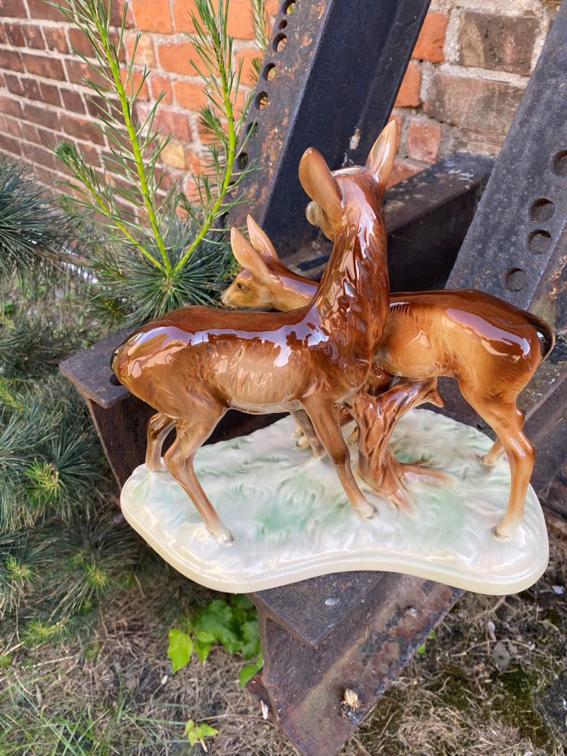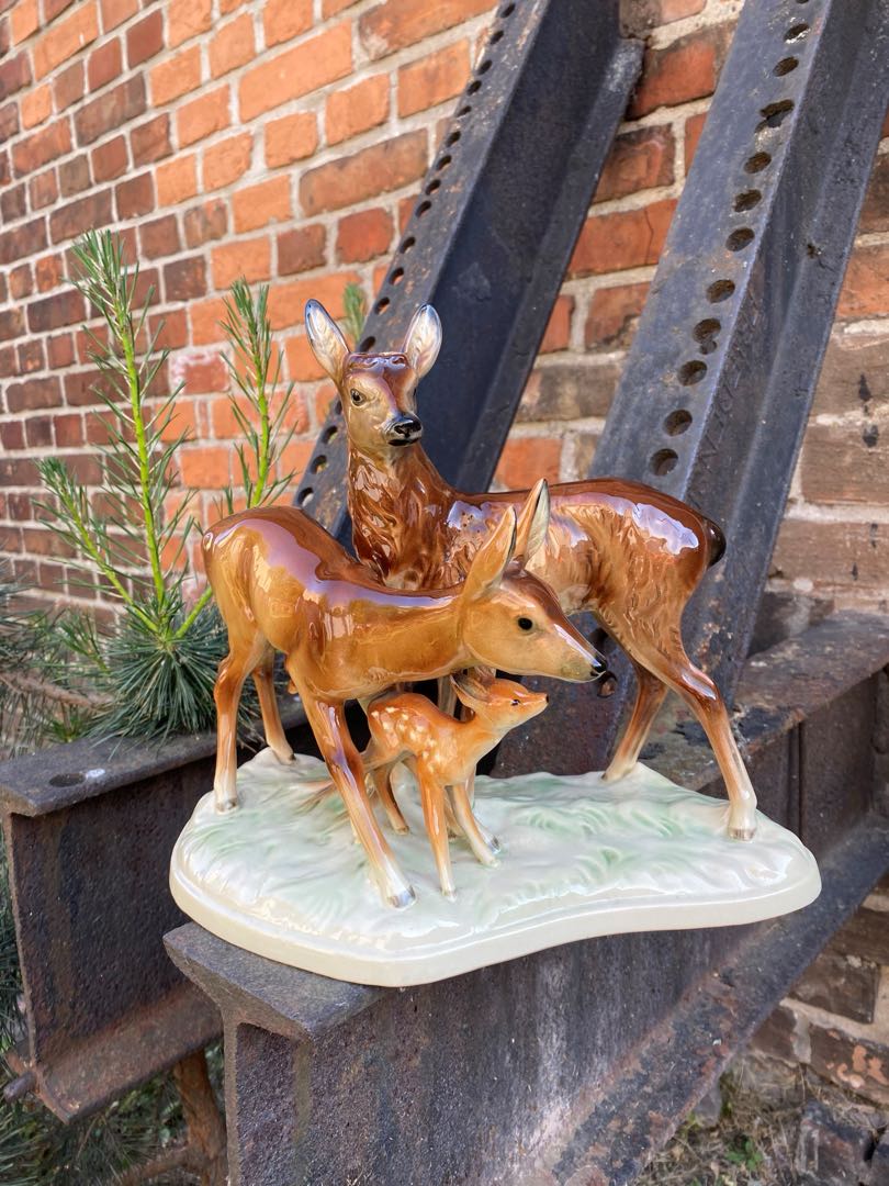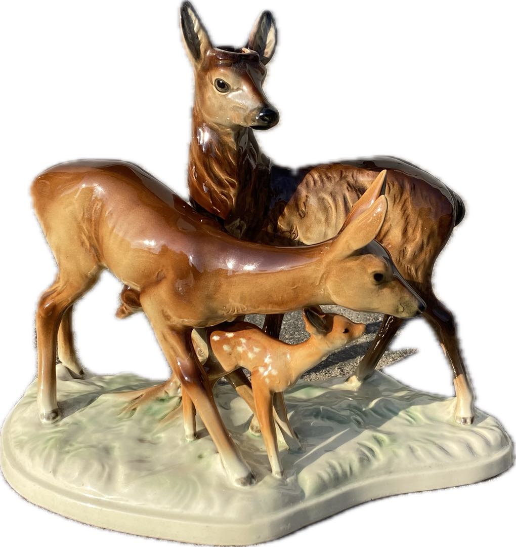 Piękna fajansowa figurka prawdopodobnie z wytwórni Hertwig Katzhutt West Germany z lat 60/70-tych. Jednemu jelonkowi brak poroża który był elementem dodatkowym. Wymiary; wys.23 x 28 x 16 cm.
