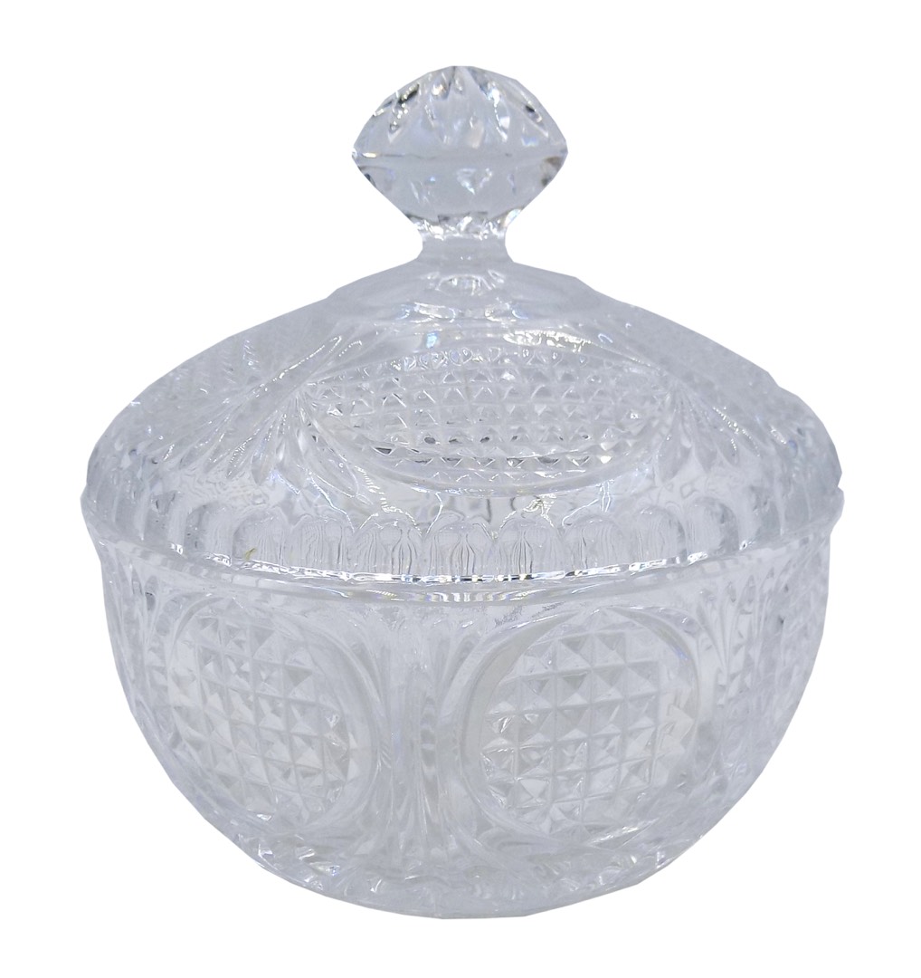 Przedstawiamy Państwu wyjątkowy produkt, który nie tylko odzwierciedla bogatą historię polskich hut szkła w okresie PRL-u, ale również emanuje niepowtarzalnym urokiem i klasyką. Nasza kryształowa bombonierka, duma polskiego rzemiosła, to prawdziwe arcydzieło o wymiarach 14 x 15,5 centymetra.