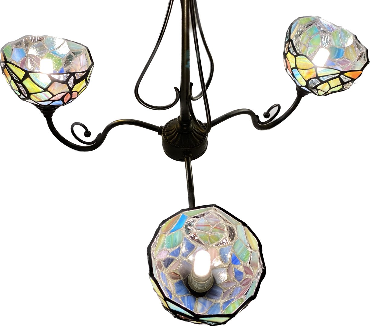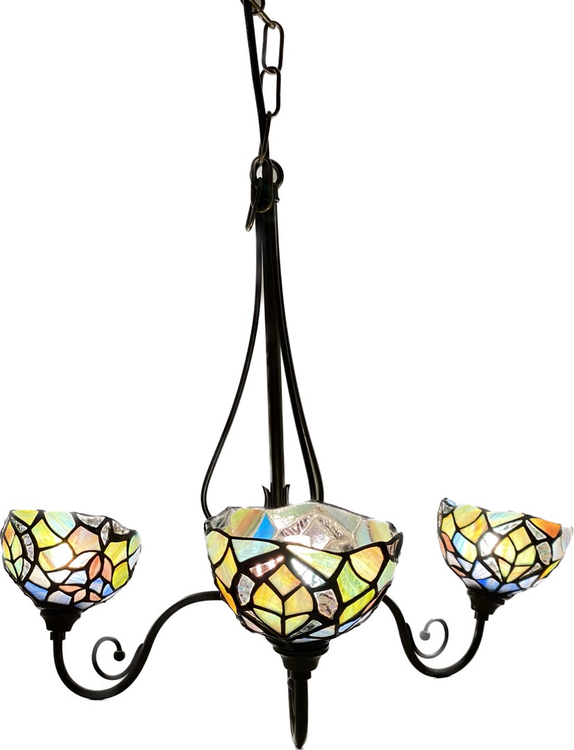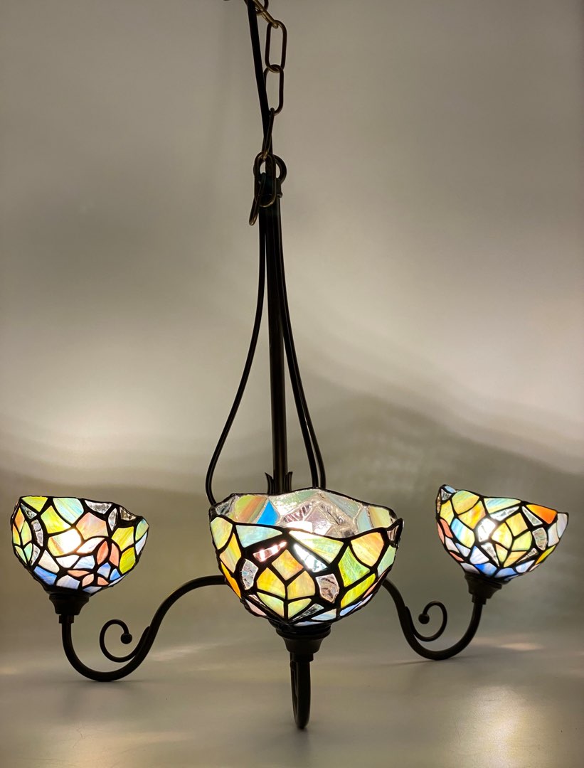 Elegancja i styl: Witrażowe klosze nadają temu żyrandolowi wyjątkowego uroku. Światło przechodzi przez kolorowe wzory, tworząc niesamowity efekt wizualny. To nie tylko oświetlenie, to prawdziwe dzieło sztuki.