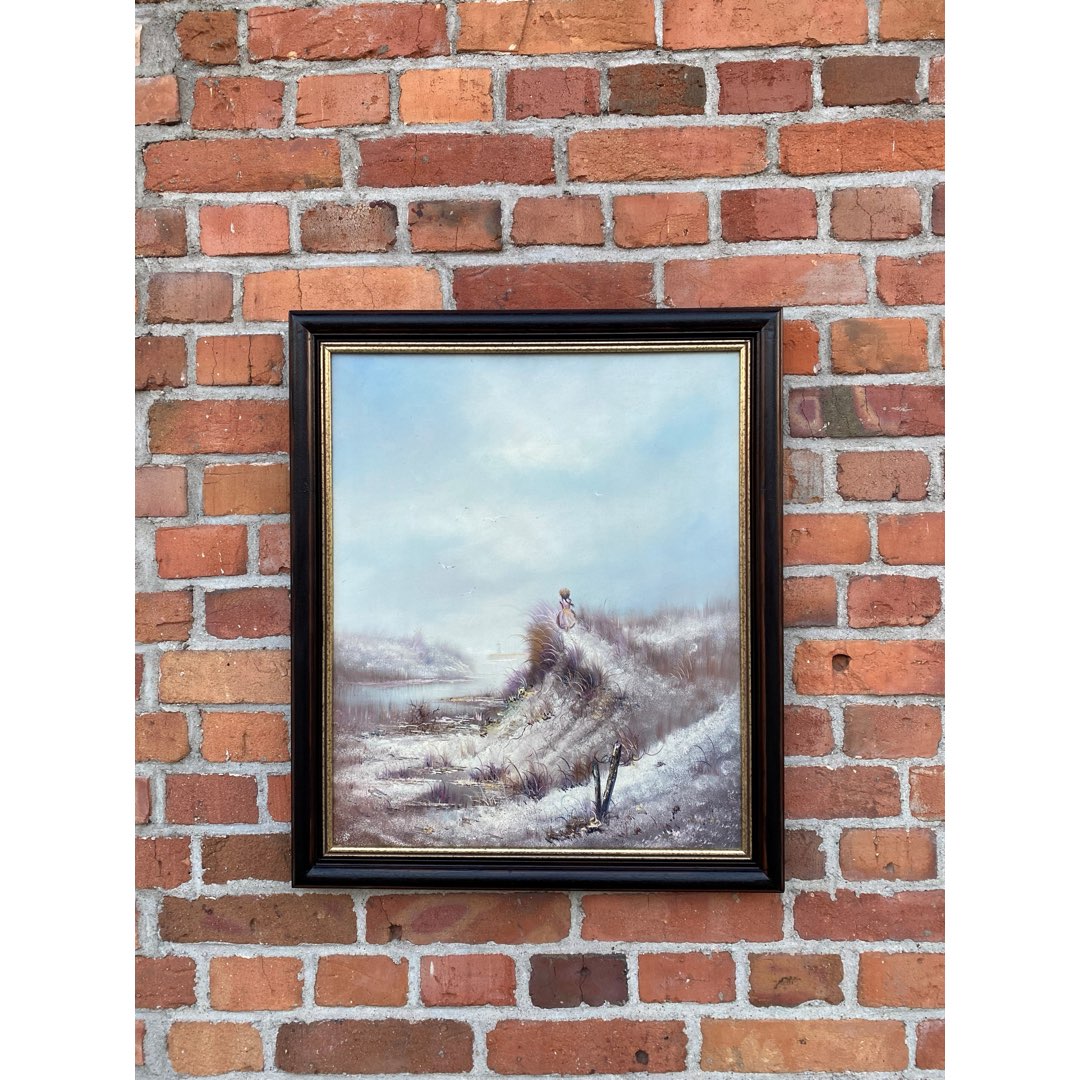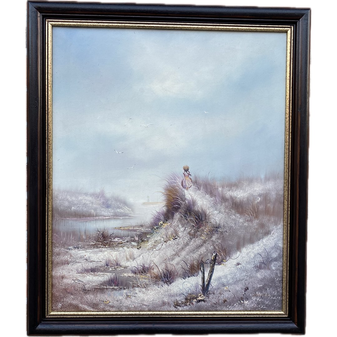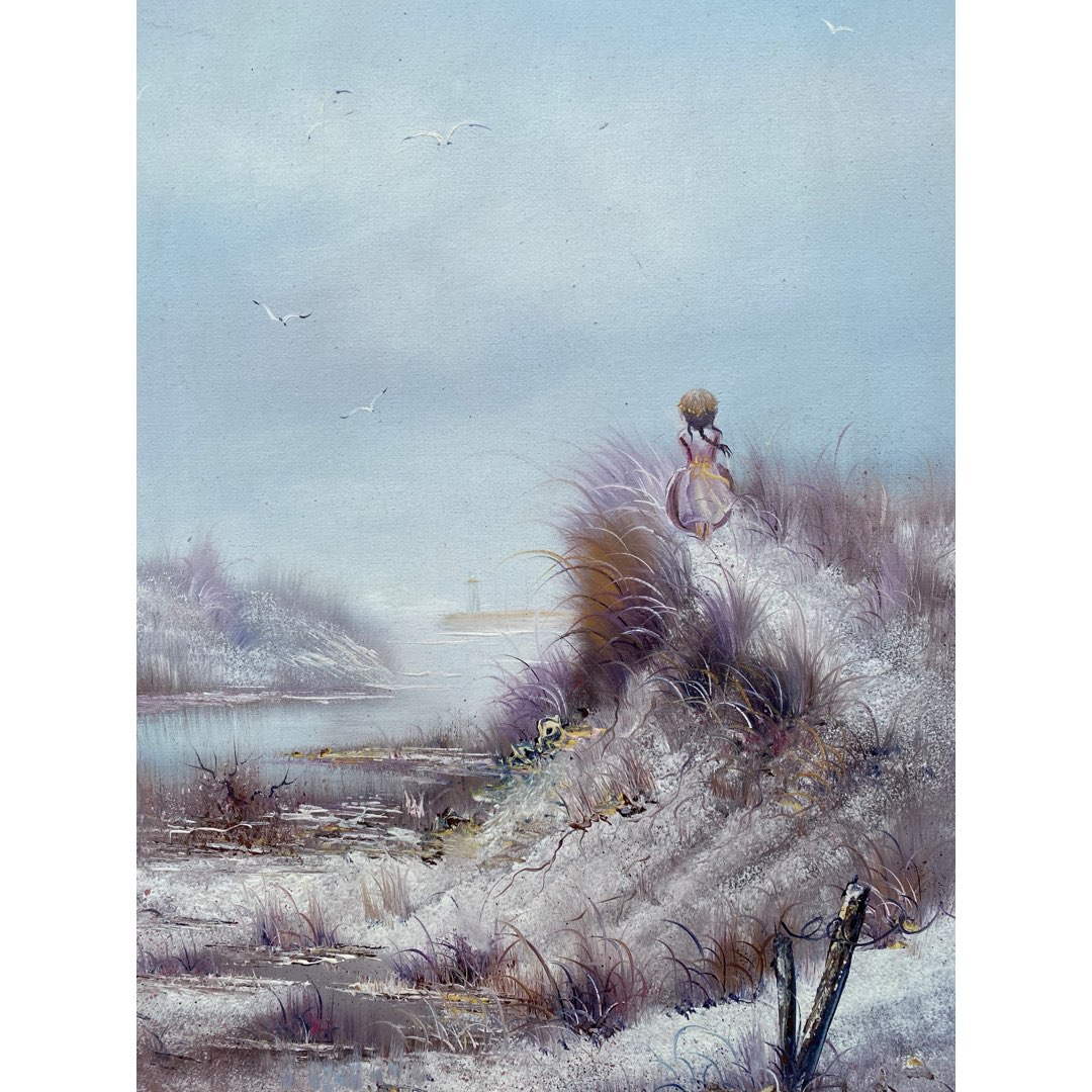 Obraz olejny na płótnie przedstawiający dziewczynkę stojącą na wydmie i spoglądającą na latarnie morską. Wymiary; wys.72 x 60(60 x 49) cm.