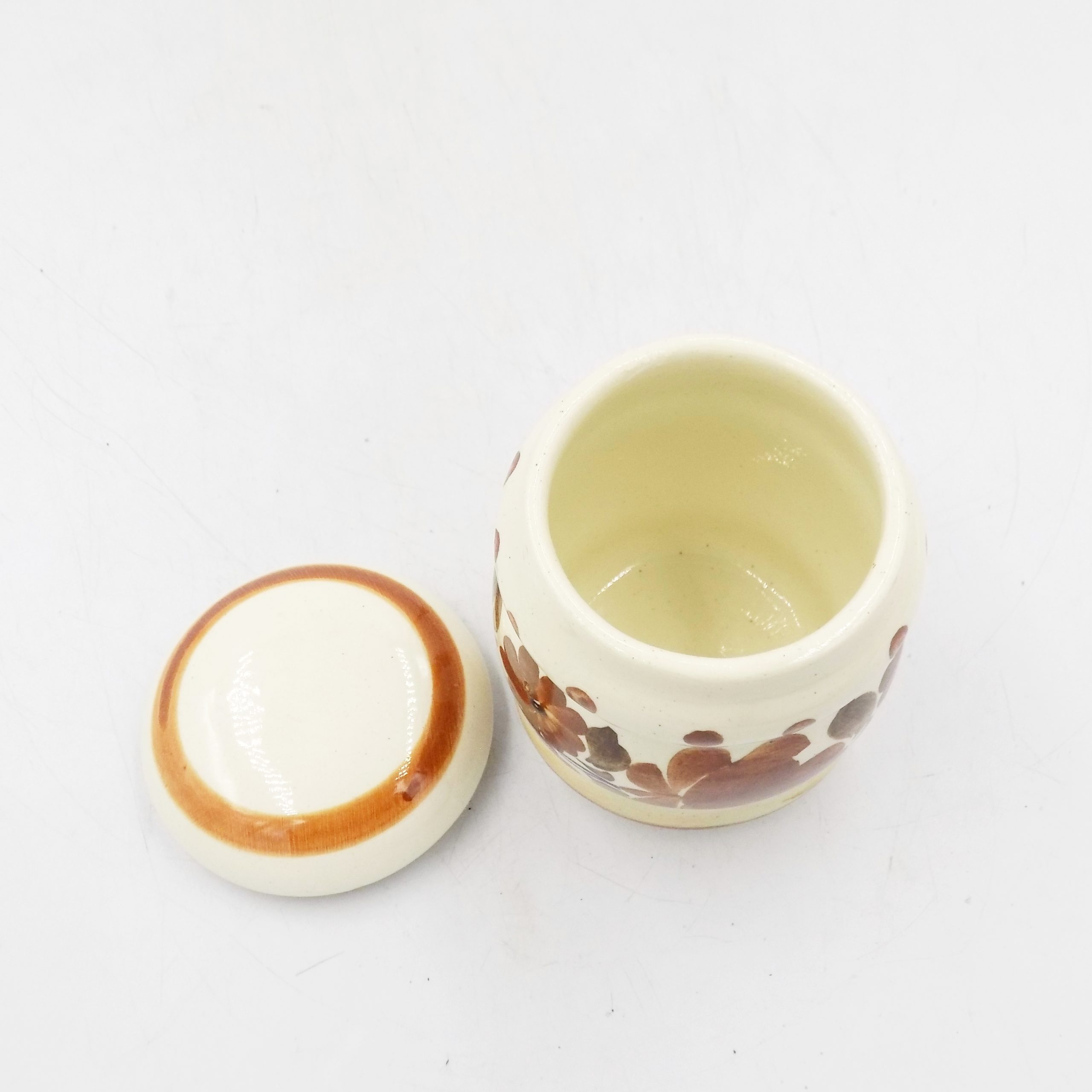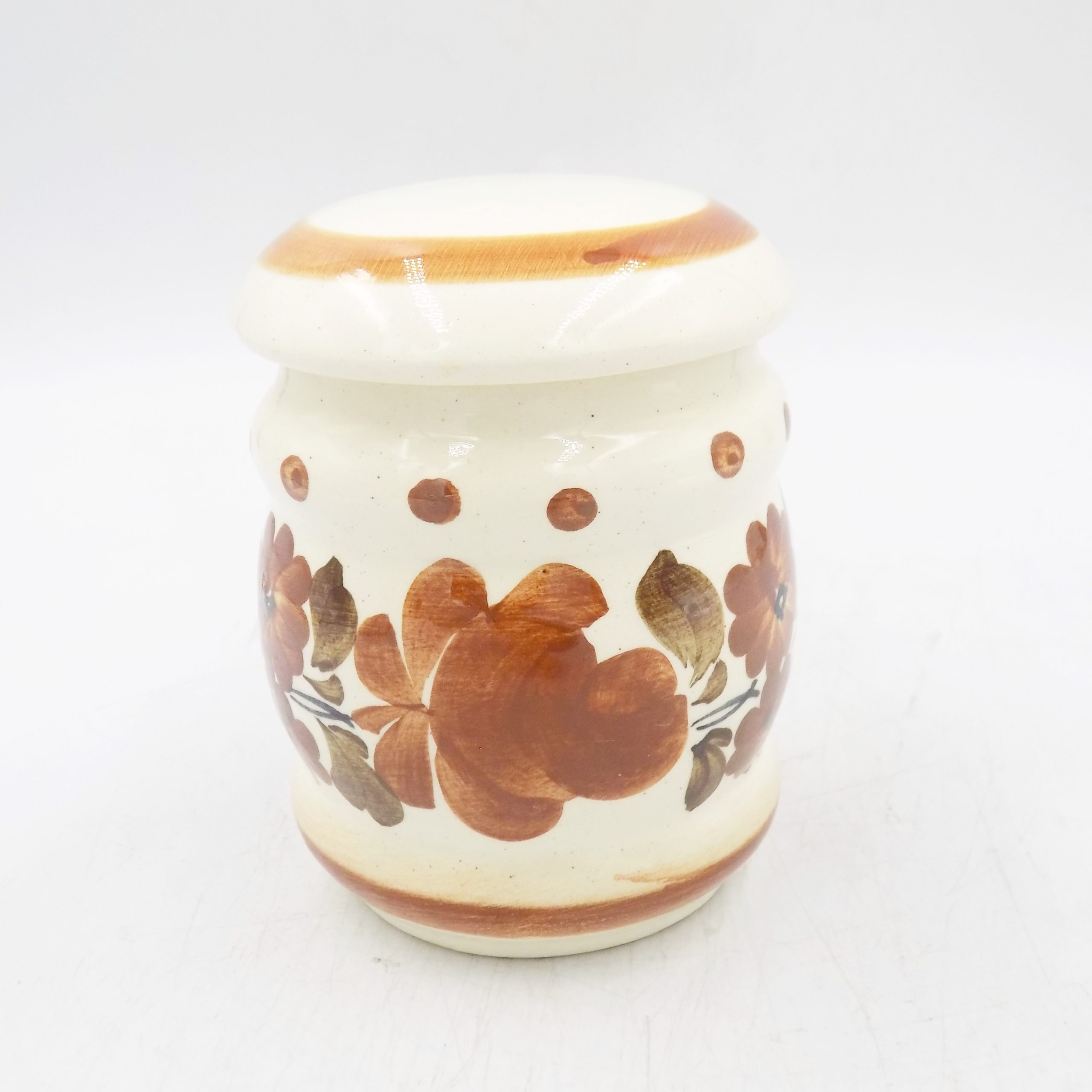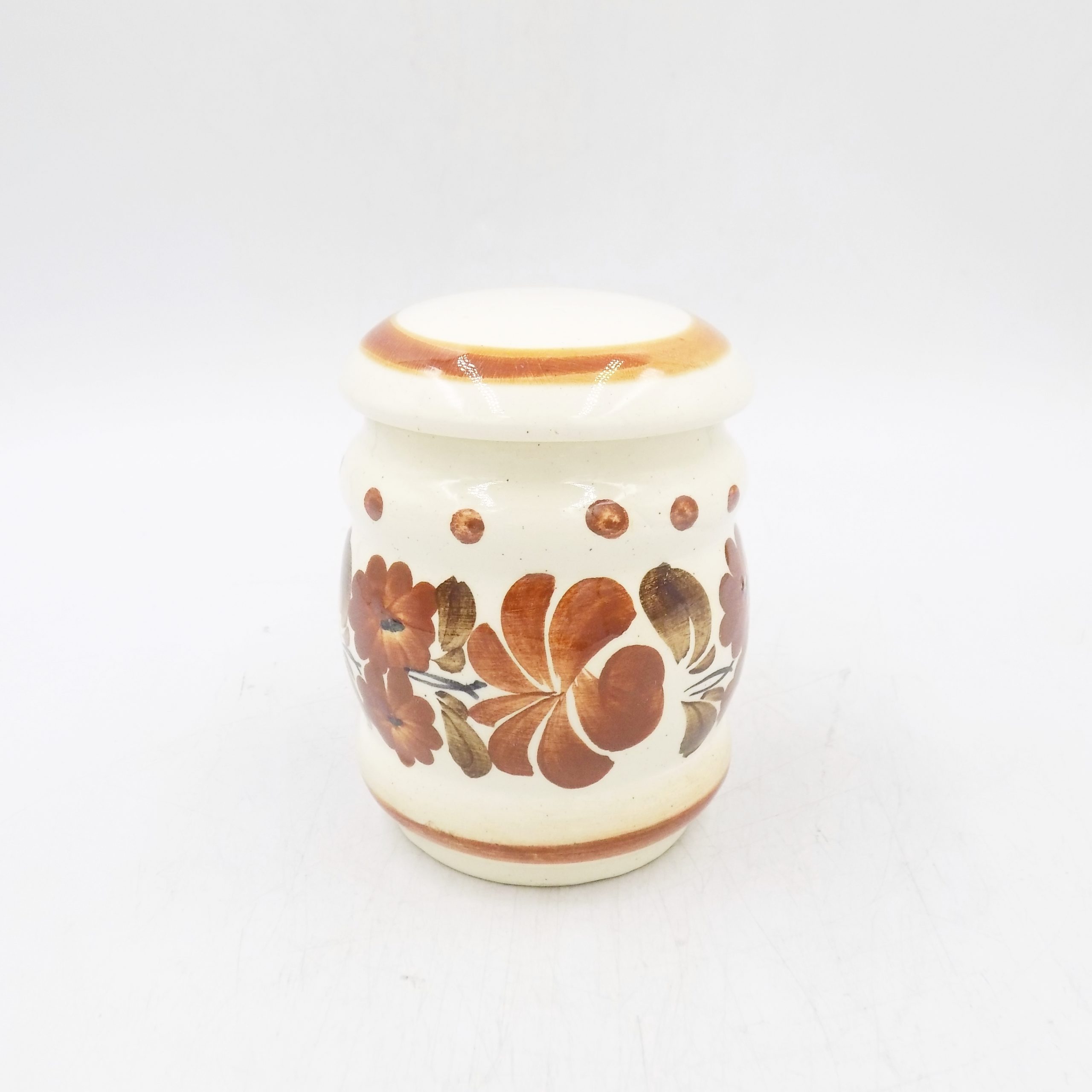 Fajansowa puszka z Włocławka z lat 70/80-tych. Sygnowana. Ręcznie malowana. Wymiary; wys.10 x 7,5 cm