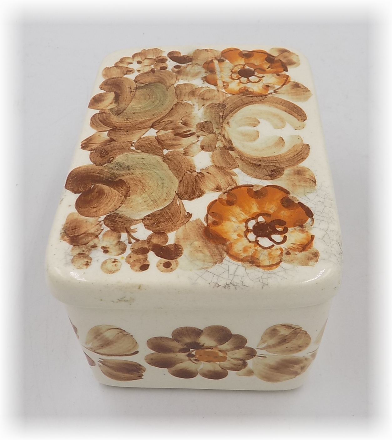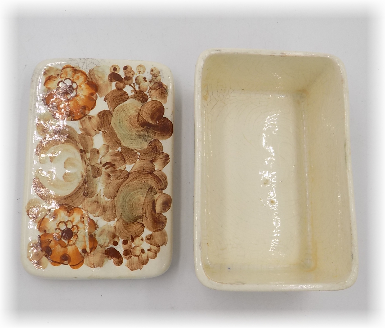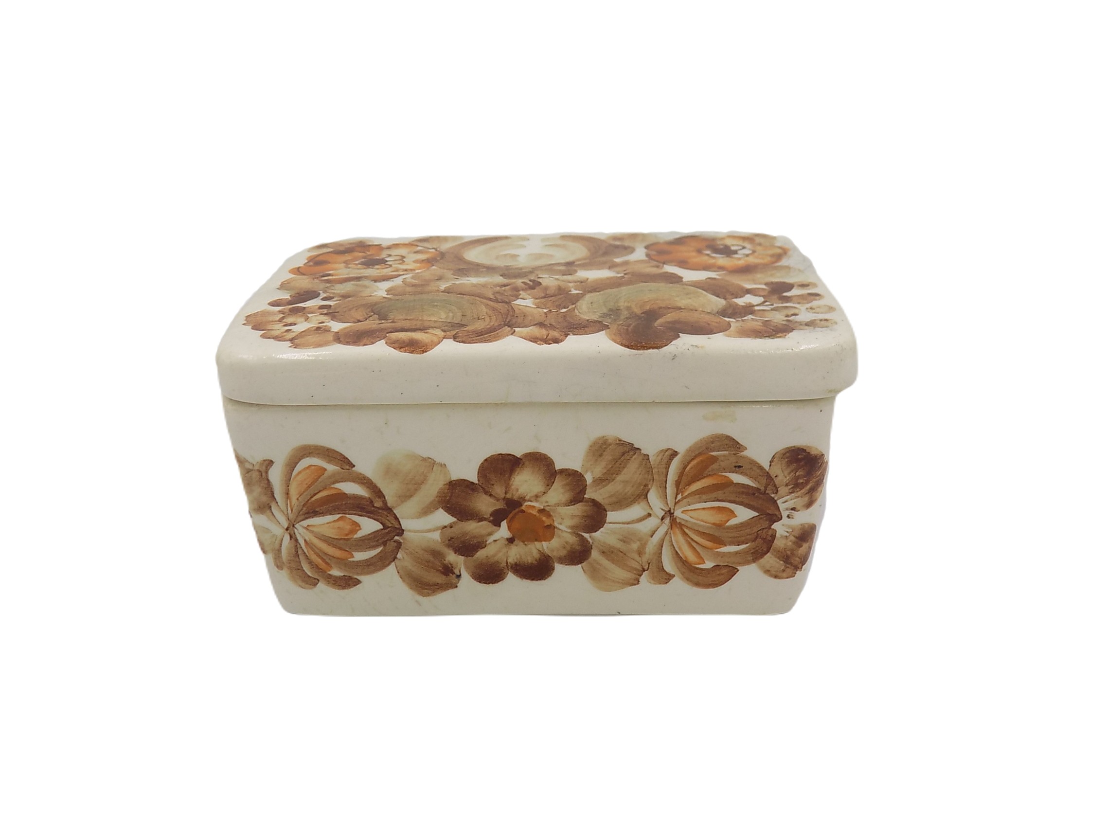 Fajansowa szkatułka z Włocławka z lat 70/80-tych. Sygnowana. Ręcznie malowana przez Lidię Leśniewską. Wzór 1062 zatwierdzony w 1969 roku. Projekt Wit Płażewski. Wymiary; wys.6,5 x 13 x 8,5 cm. Harys