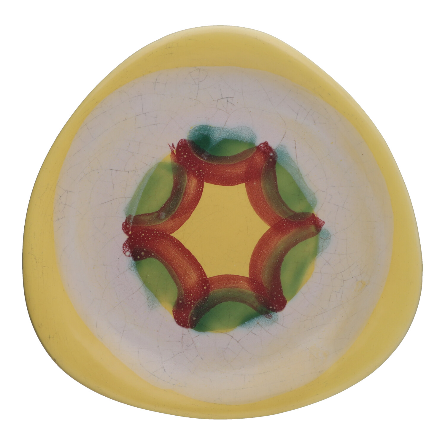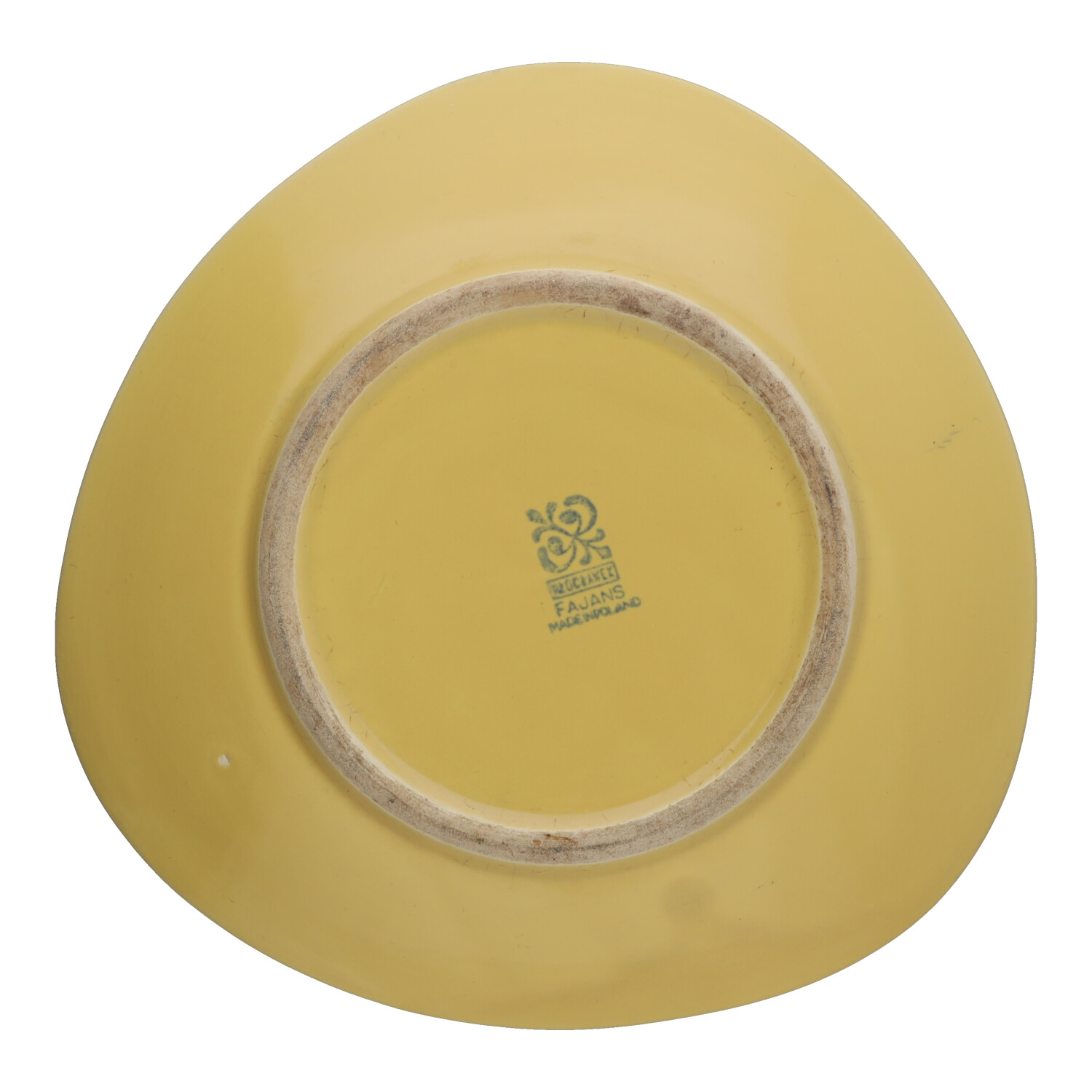 Fajansowy talerz deserowy z Włocławka z lat 60/70-tych. Sygnowany. Ręcznie malowany. Wzór 185 zatwierdzony w 1957 roku. Projekt Elżbieta Piwek.