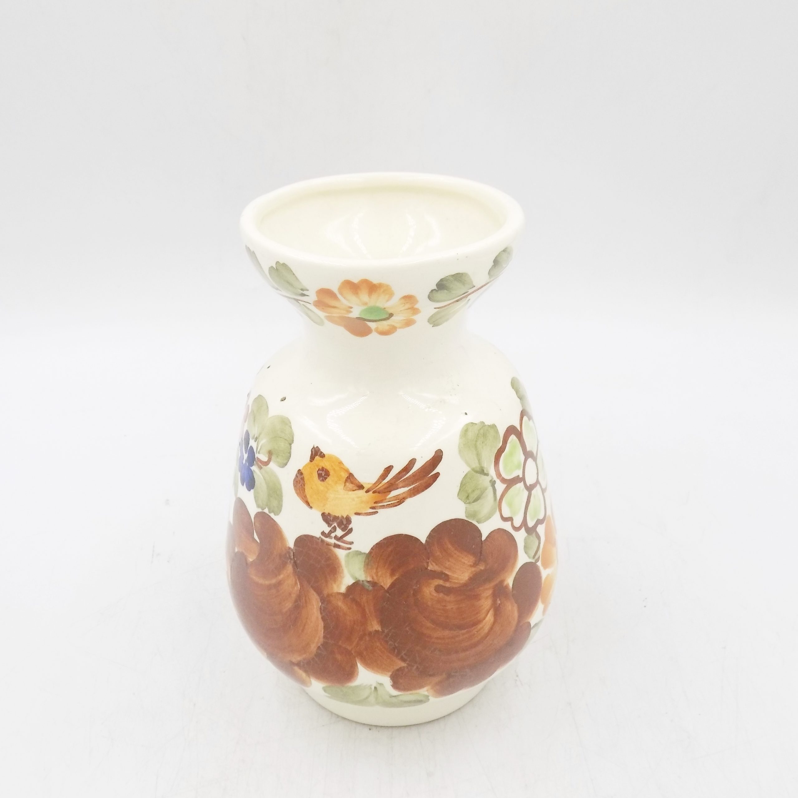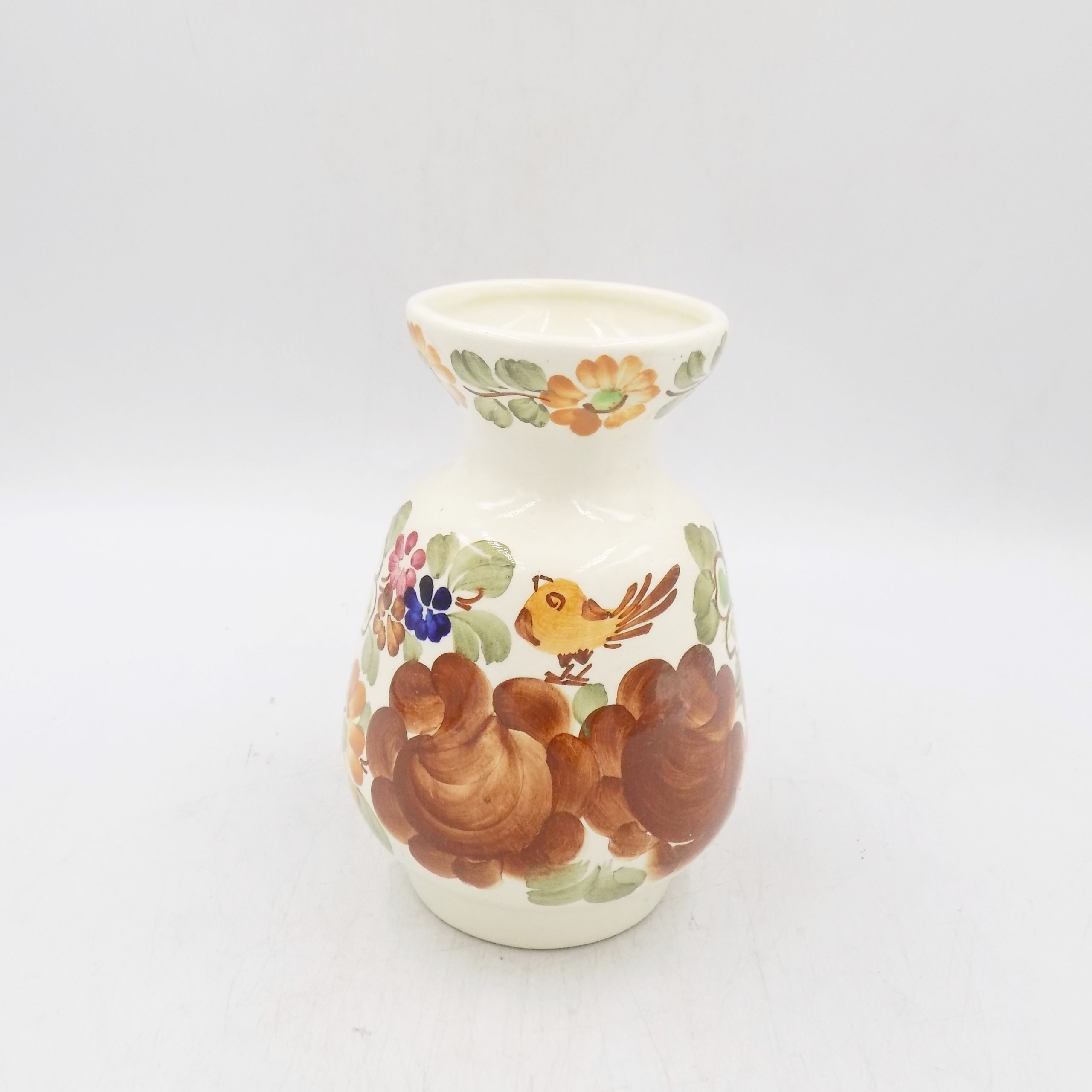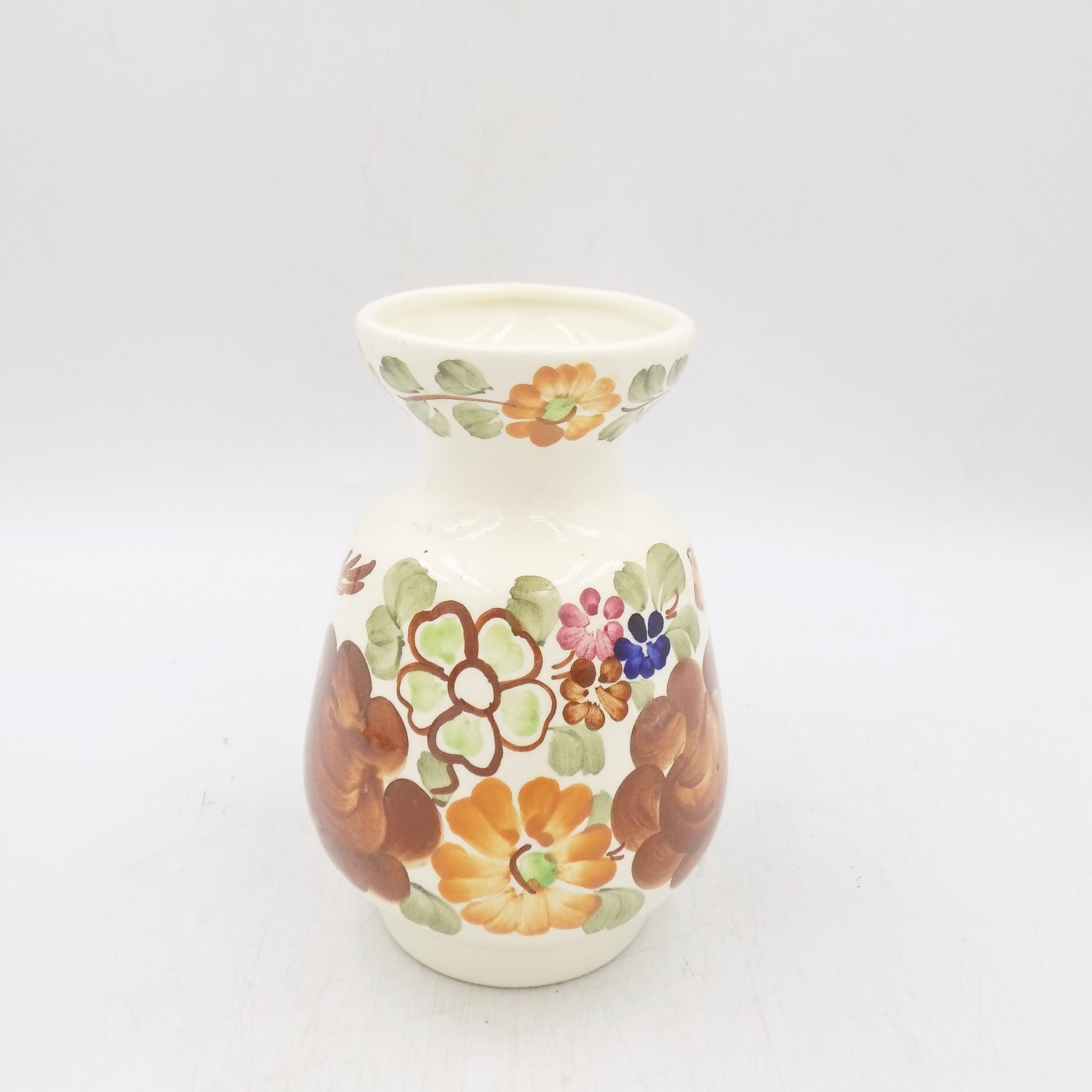 Fajansowy wazon z Włocławek z lat 70/80-tych. Sygnowany. Ręcznie malowany przez I.Nowakowską. Wymiary; wys.14 cm.