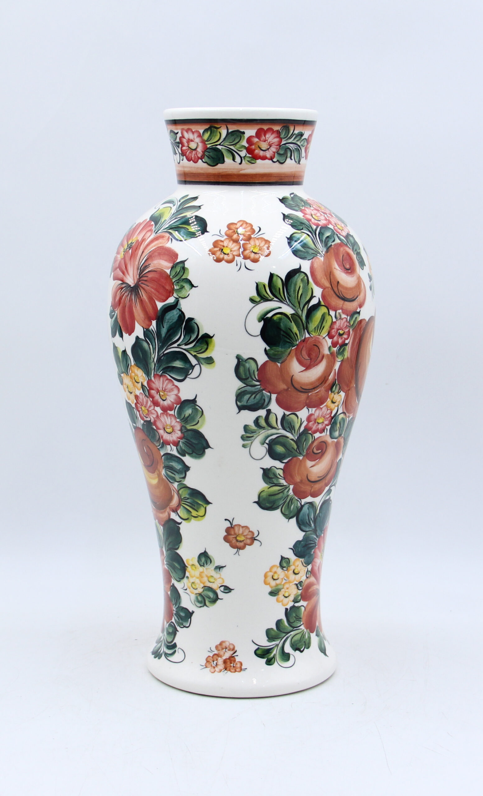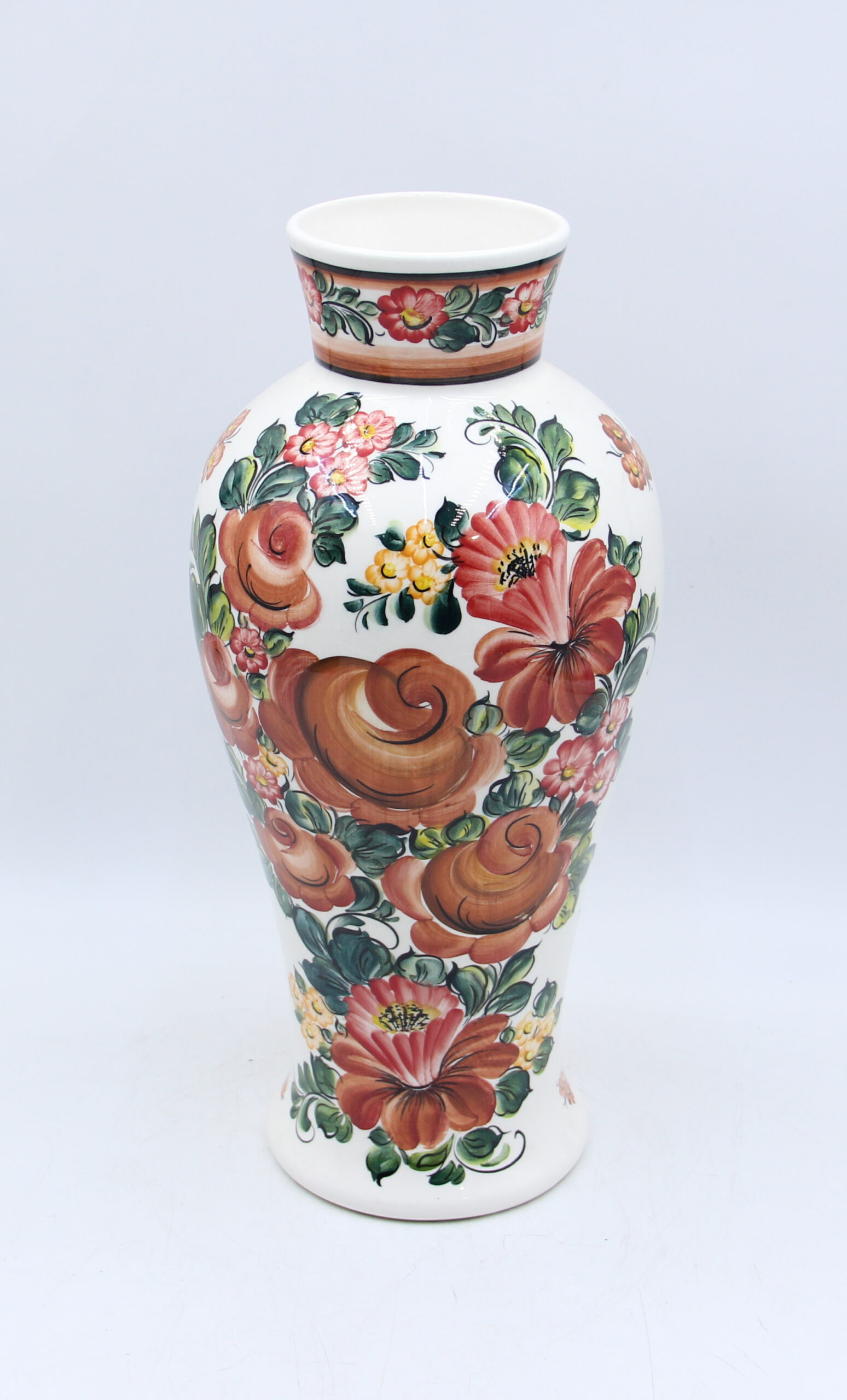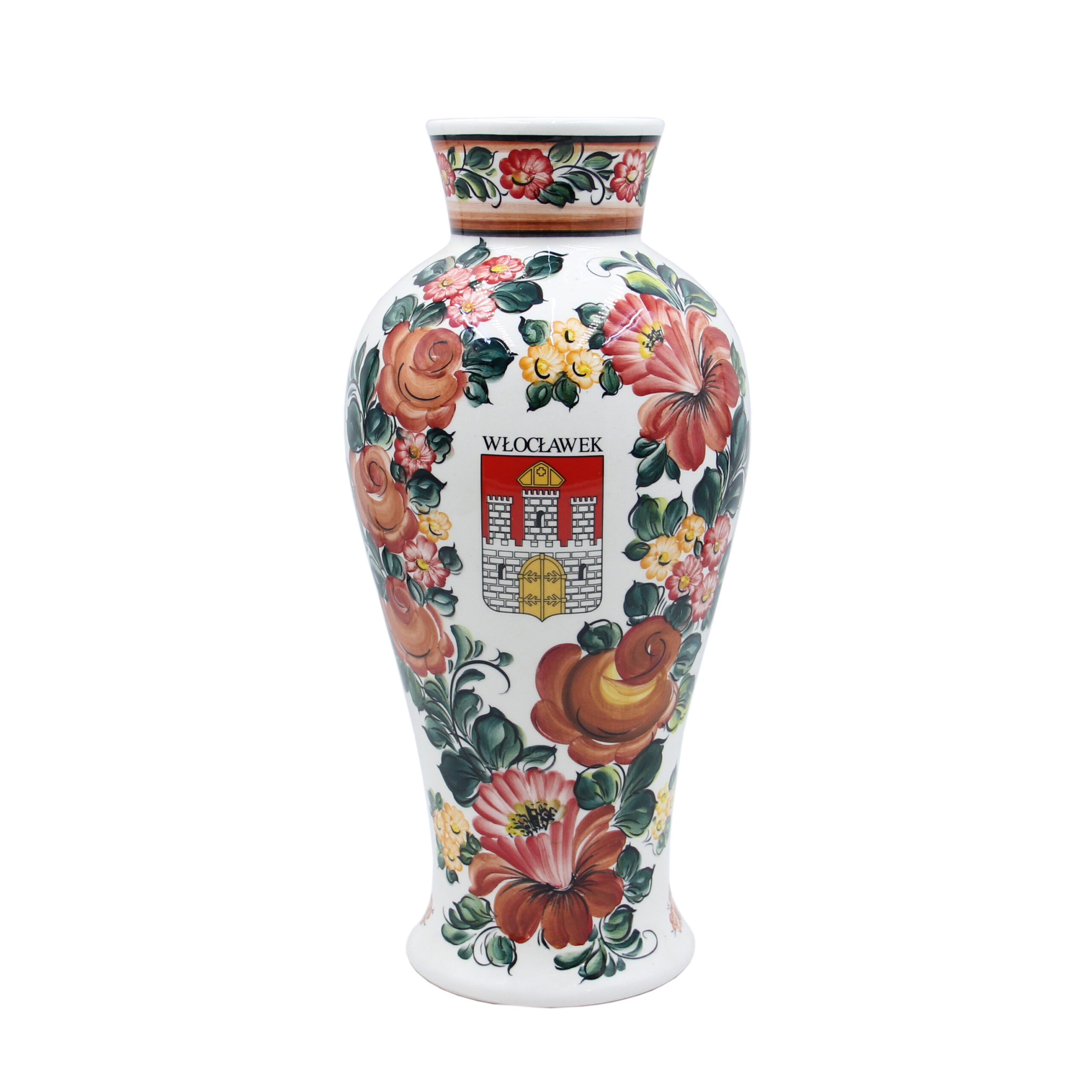 Fajansowy wazon Wincenty z Włocławka z herbem Włocławka. Sygnowany. Ręcznie malowany przez W. Kaczorowską. Ręcznie podpisany przez malarkę. Wzór 629/5.