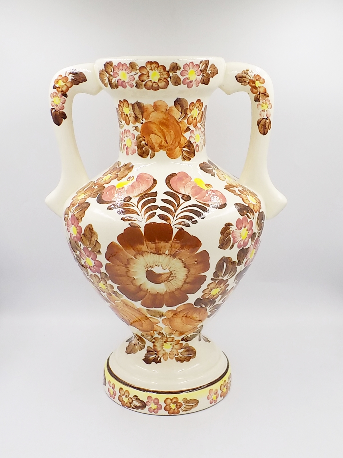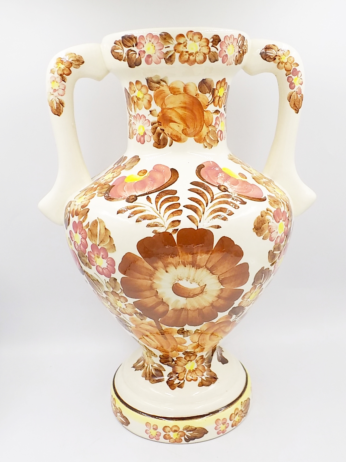 Fajansowy wazon z Włocławka z lat 70/80-tych. Sygnowany. Ręcznie malowany. Wzór 1148 zatwierdzony w 1971 r. Wymiary;wys.41 x szer.31 cm.