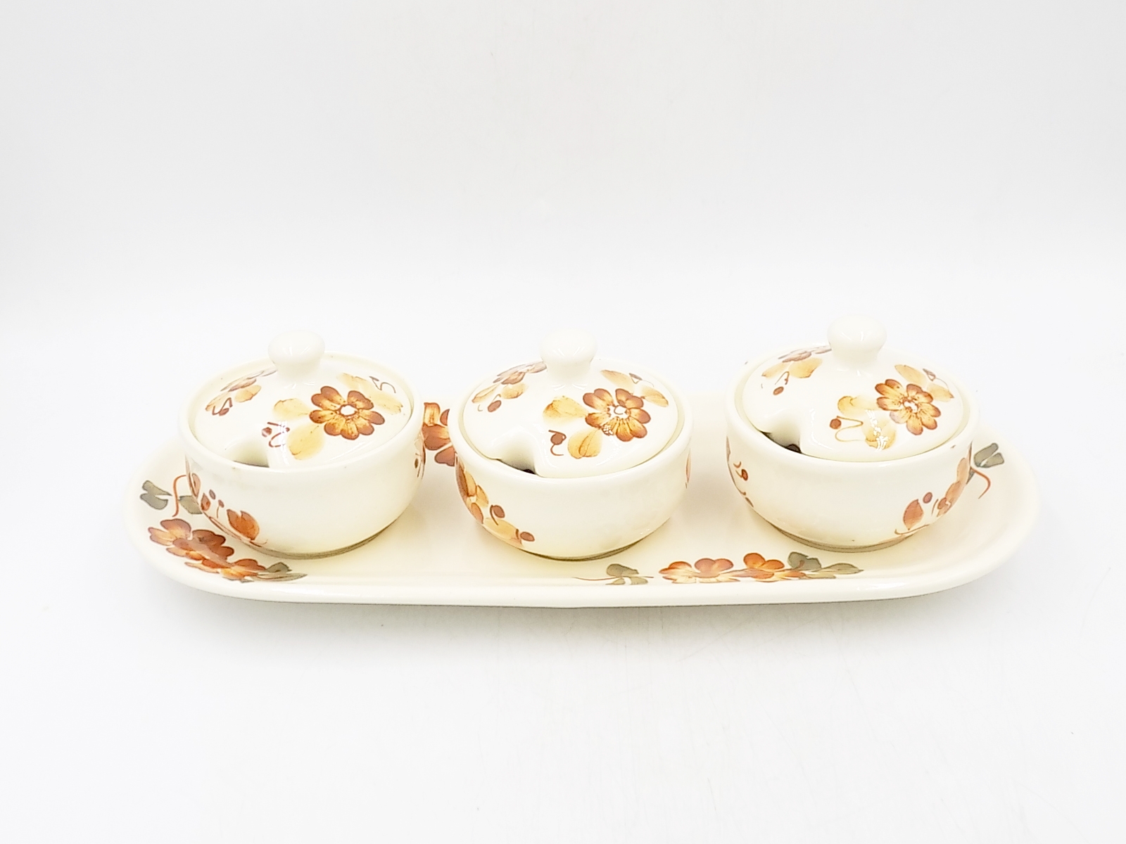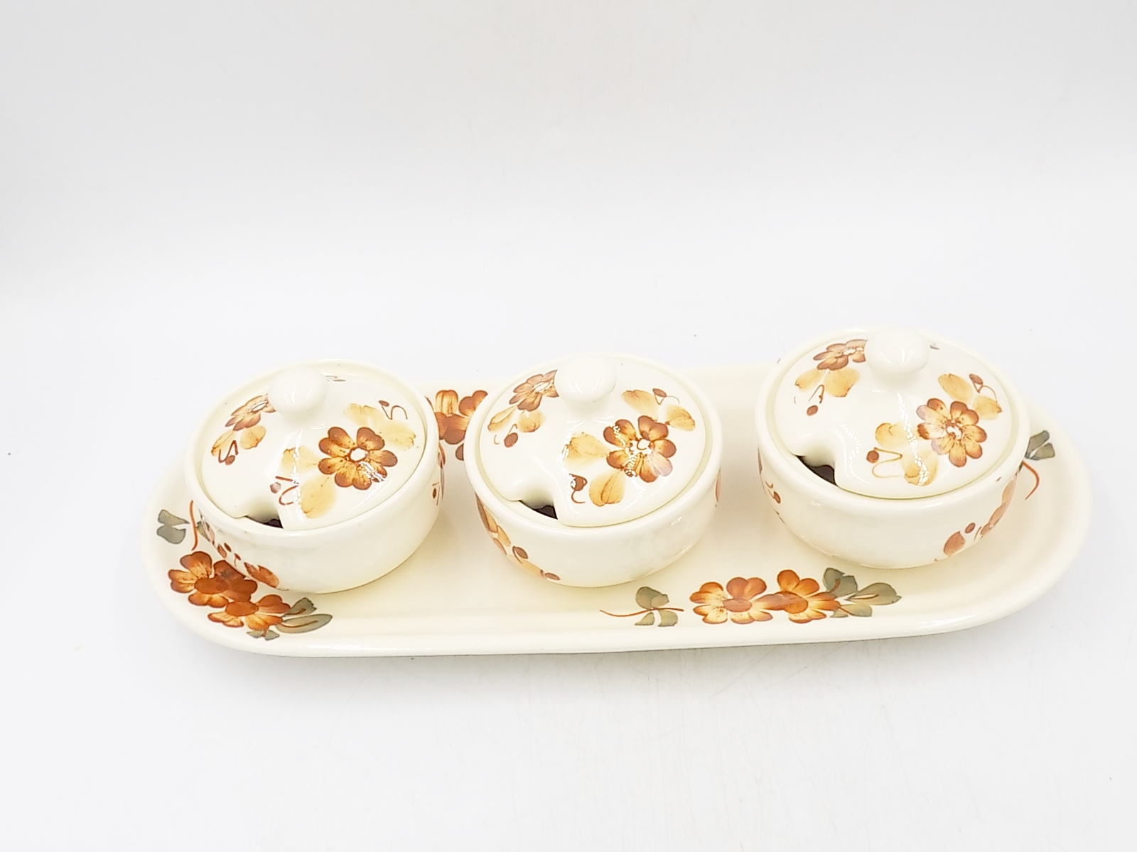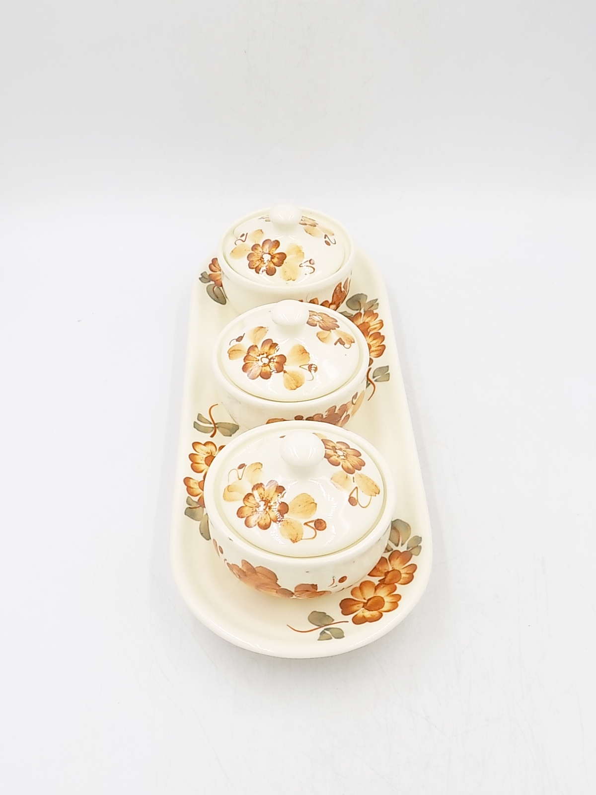 Fajansowy zestaw do przypraw z Włocławka z lat 70/80-tych. Sygnowany. Ręcznie malowany. Wymiary; wys.7 x 8,5 cm, półmisek 32,5 x 12,5 cm.