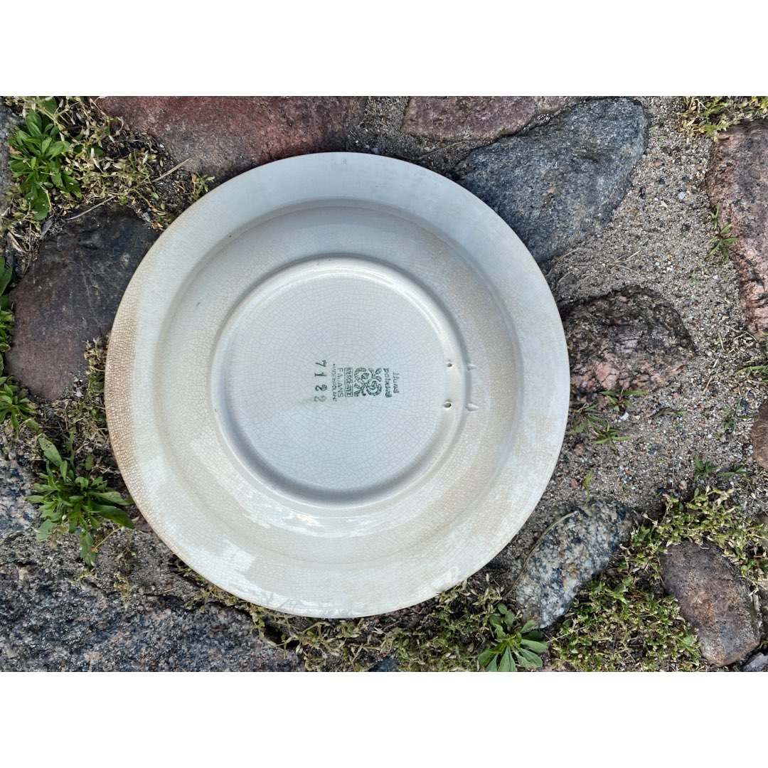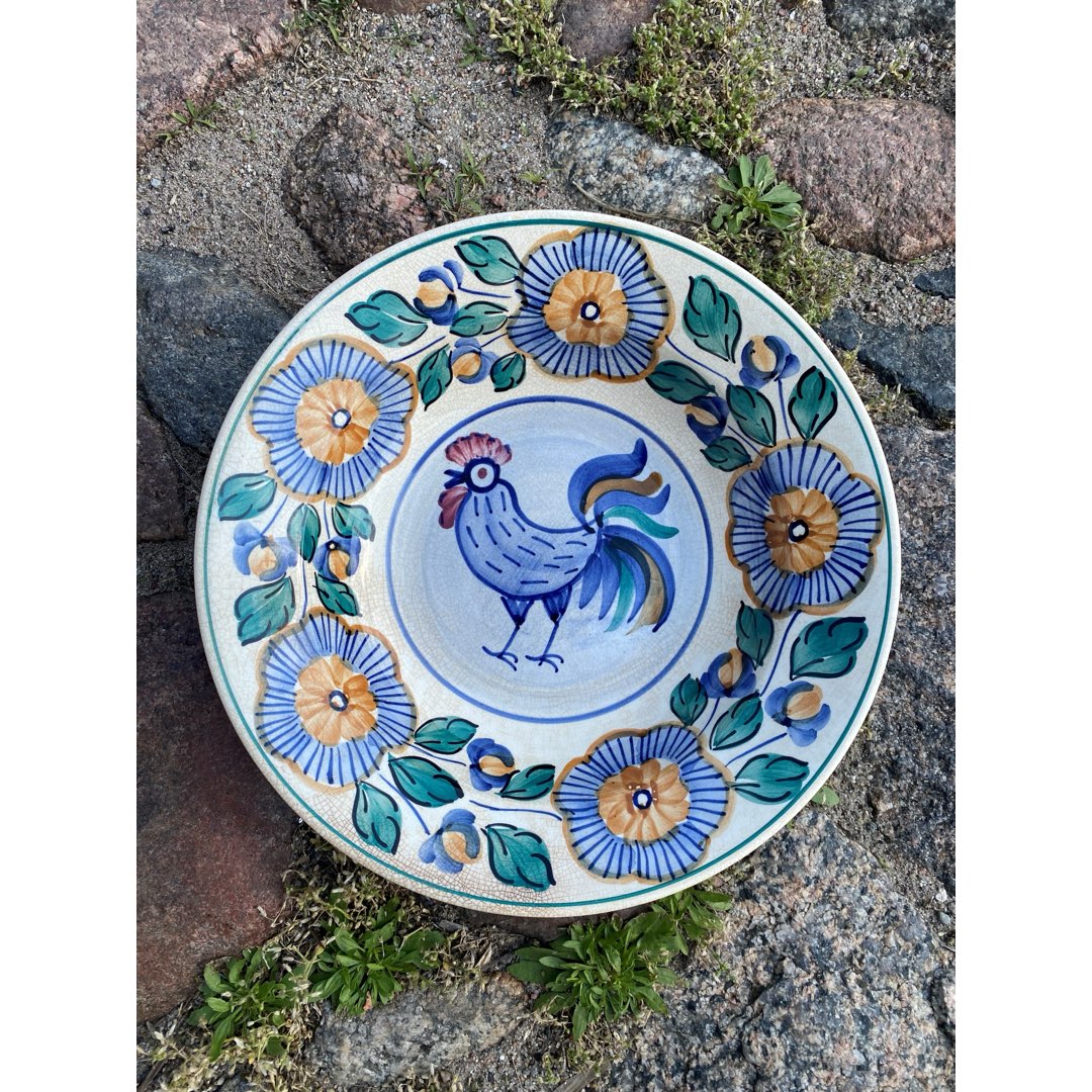 Fajansowy talerz dekoracyjny z Włocławka z lat 60/70-tych. Sygnowany. Ręcznie malowany. Przebarwienia i harys. Wymiary; wys. 5,5 x 25 cm.