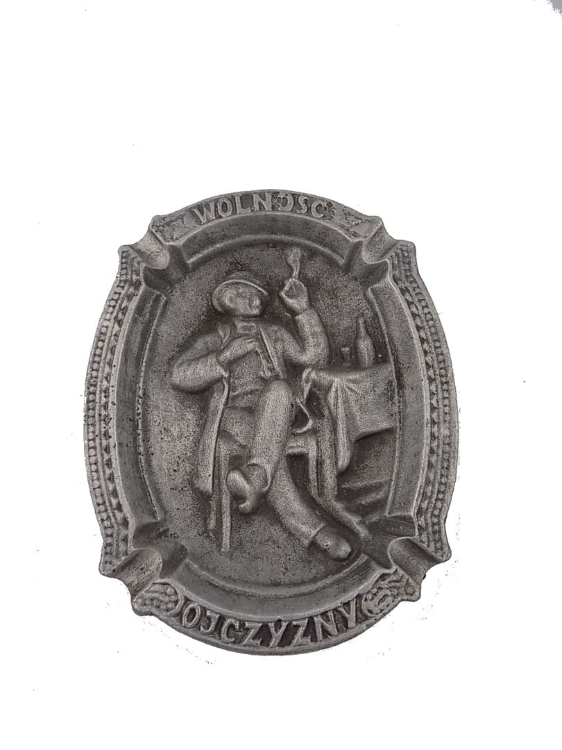 Zabytkowa popielniczka z cyny z napisem "Wolność Ojczyzny". Wymiary; 3 x 17 x 13 cm.