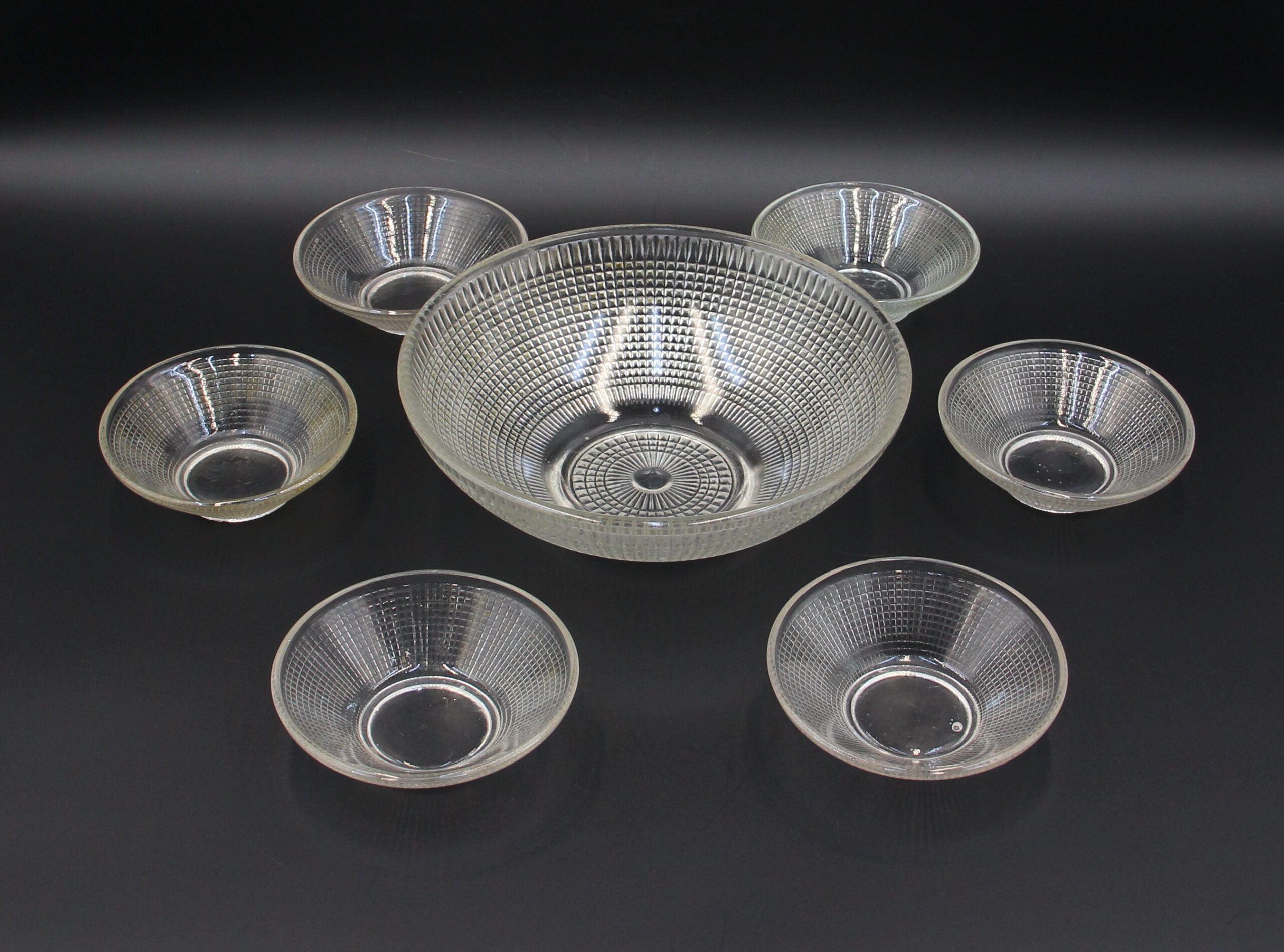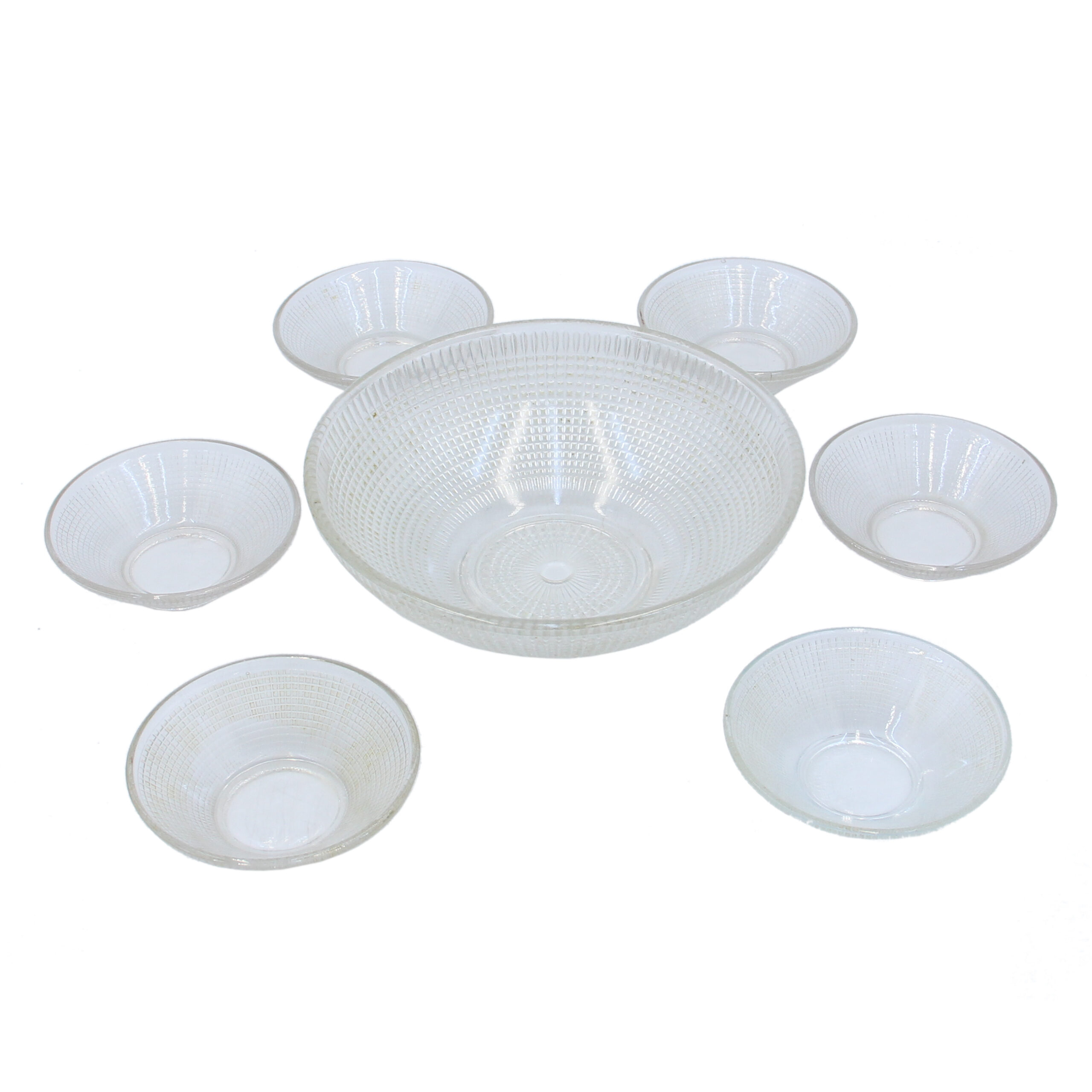 Zestaw do sałatek z okresu PRL – duża miska i 6 salaterek.