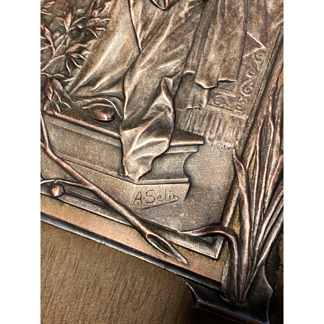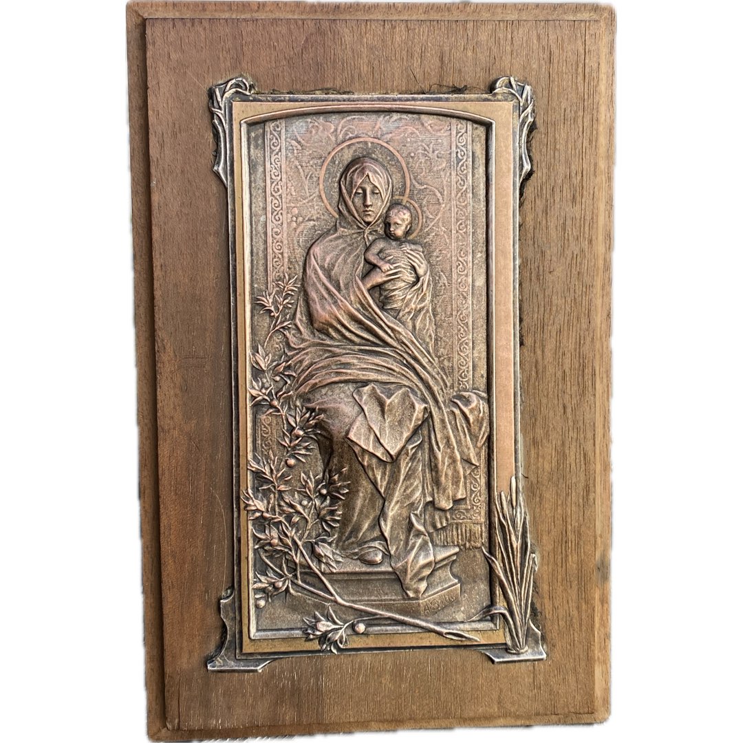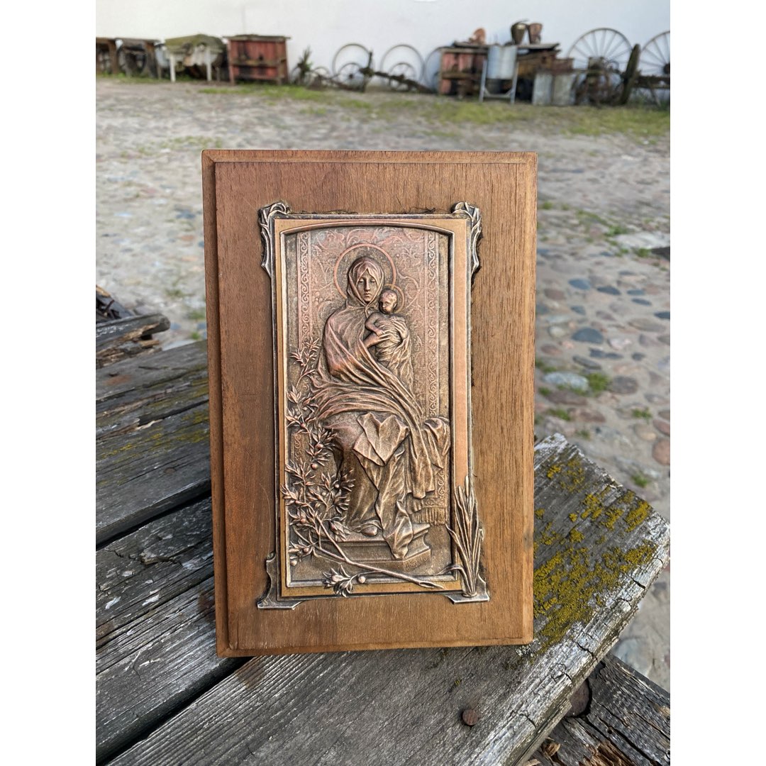 Metalowa ikona miedziowana na dębowej desce utrzymana w klimacie secesji prawdopodobnie z początku XX w. Sygnowana A. Selin. Wymiary; wys.25,5 x 16,5 cm.