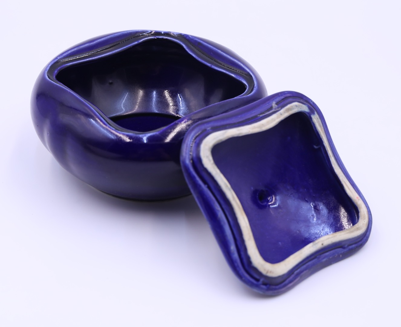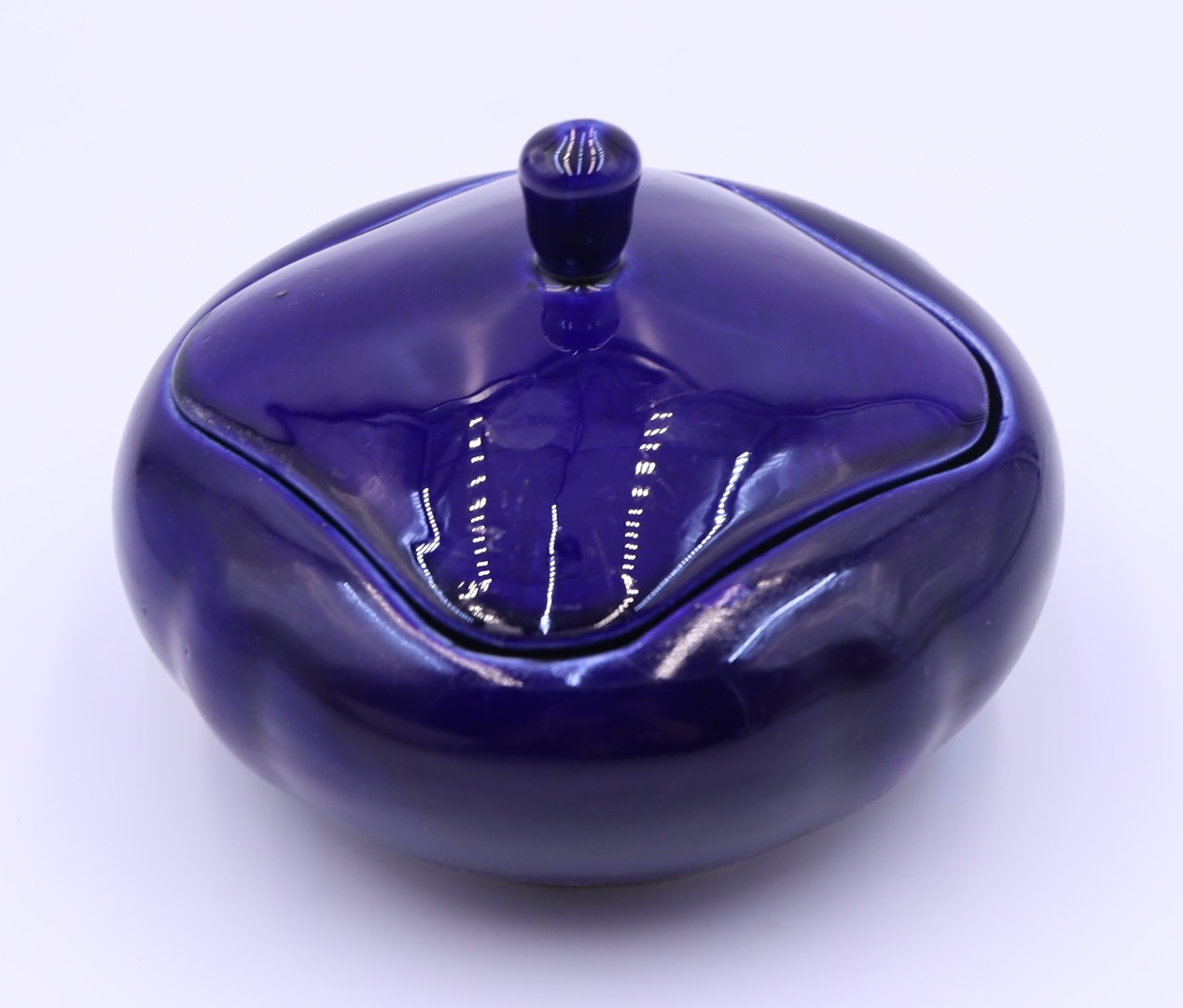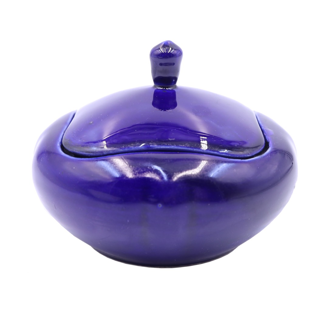 Kobaltowy kolor bombonierki zachwyca głębokim odcieniem nocnego nieba, dodając jej szlachetności i elegancji. Oryginalny projekt jest doskonale widoczny na całej powierzchni produktu, podkreślając precyzję wykonania i dbałość o szczegóły, które były charakterystyczne dla ówczesnych osiągnięć wzornictwa przemysłowego.