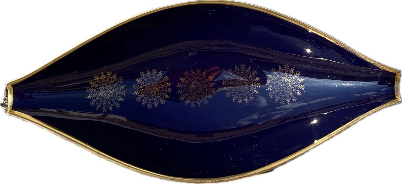 Bardzo ładny, dekoracyjny półmisek kobaltowy dekorowany złotymi rozetami i szlaczkiem z Fabryki Porzellanfabrik Unterweißbach Germany.