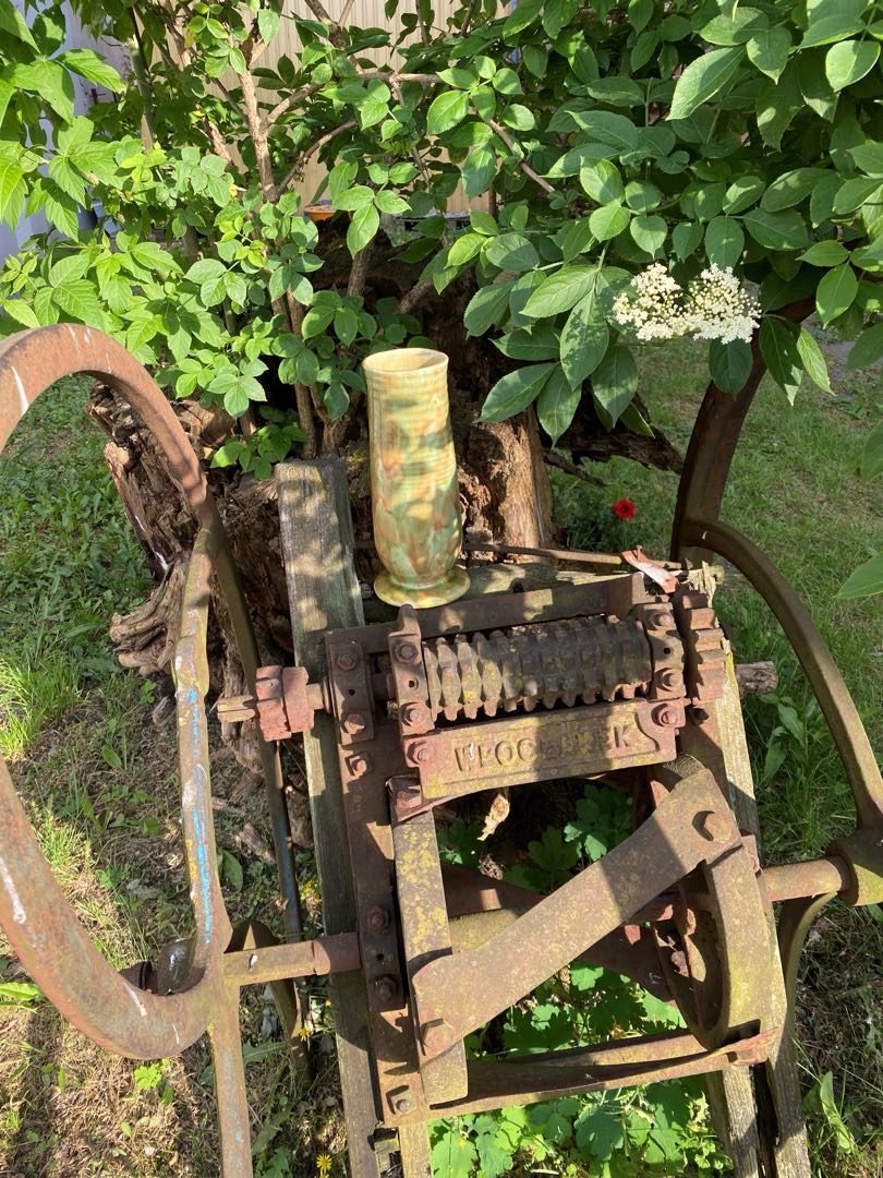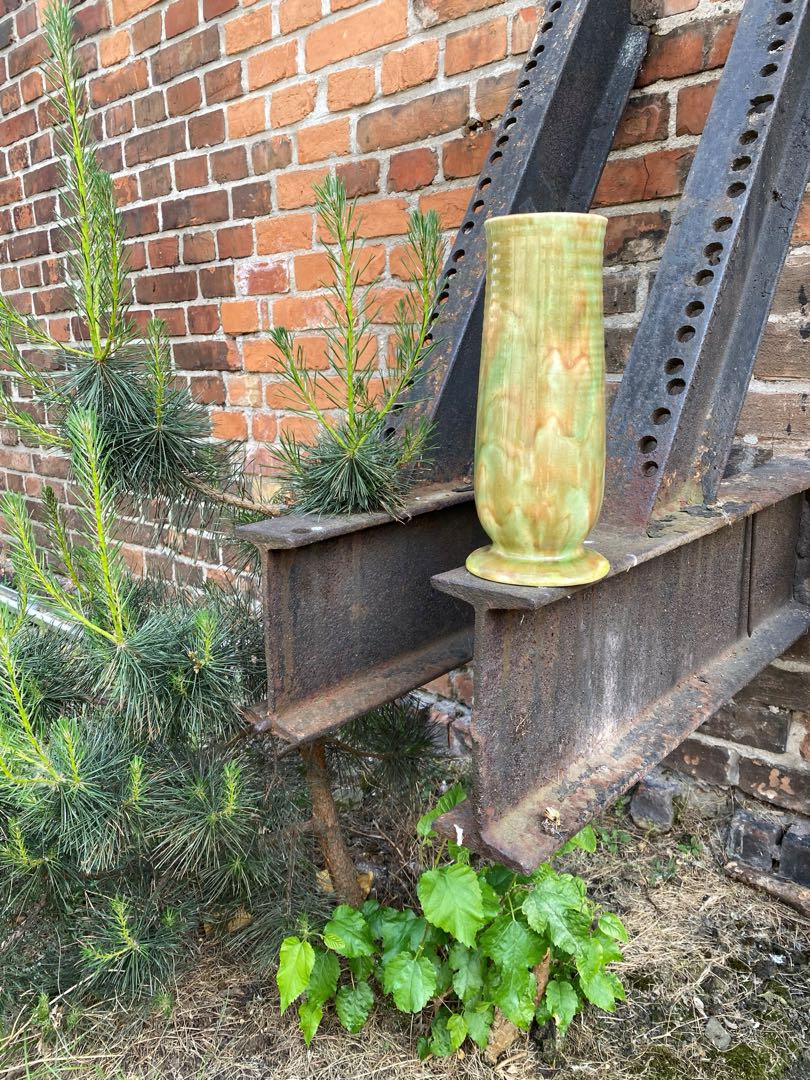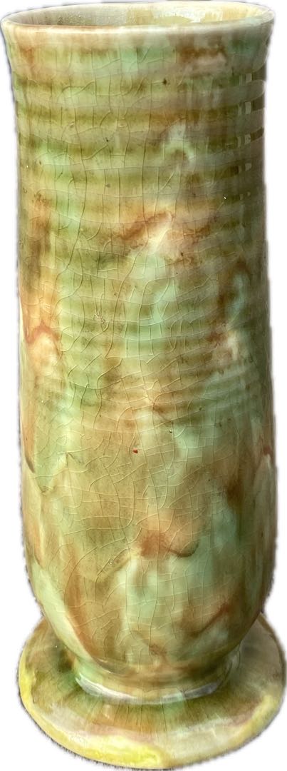 Fajansowy wazon z Włocławka z lat 50-tych. Sygnowany. Zdobiony metodą natryskowa. Wymiary; wys. 24 x 10 cm.