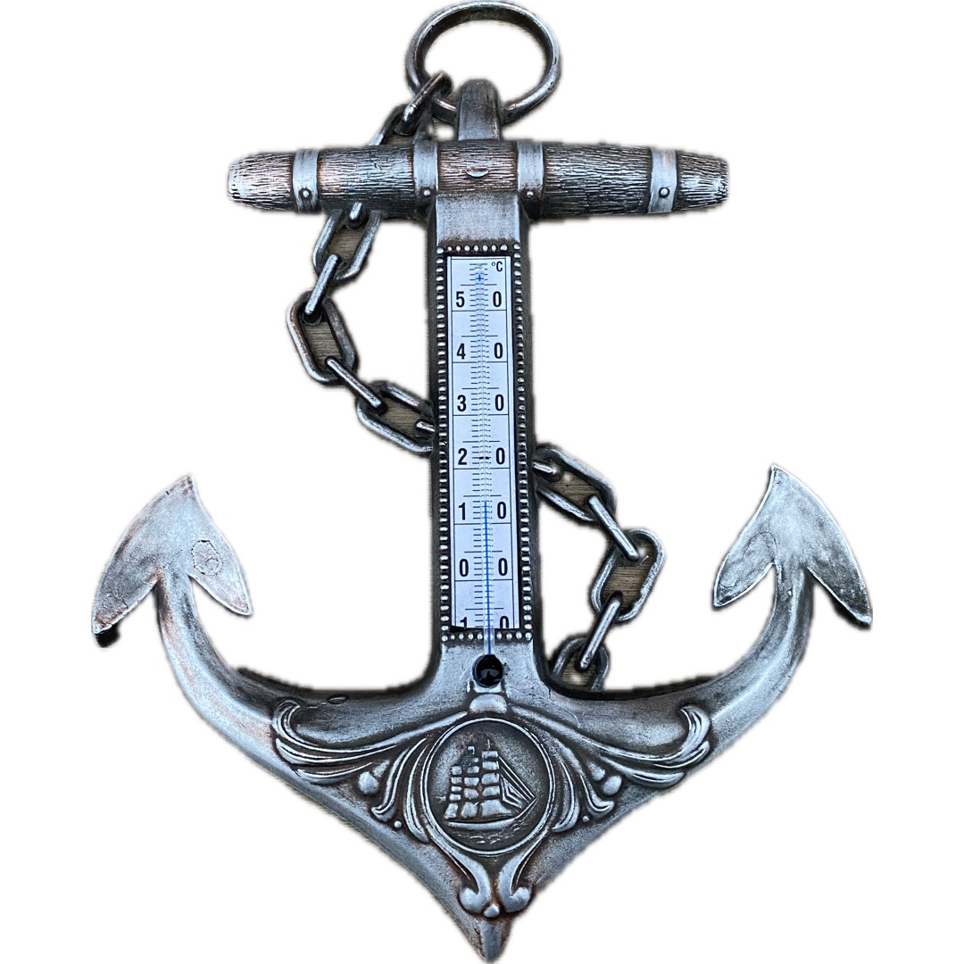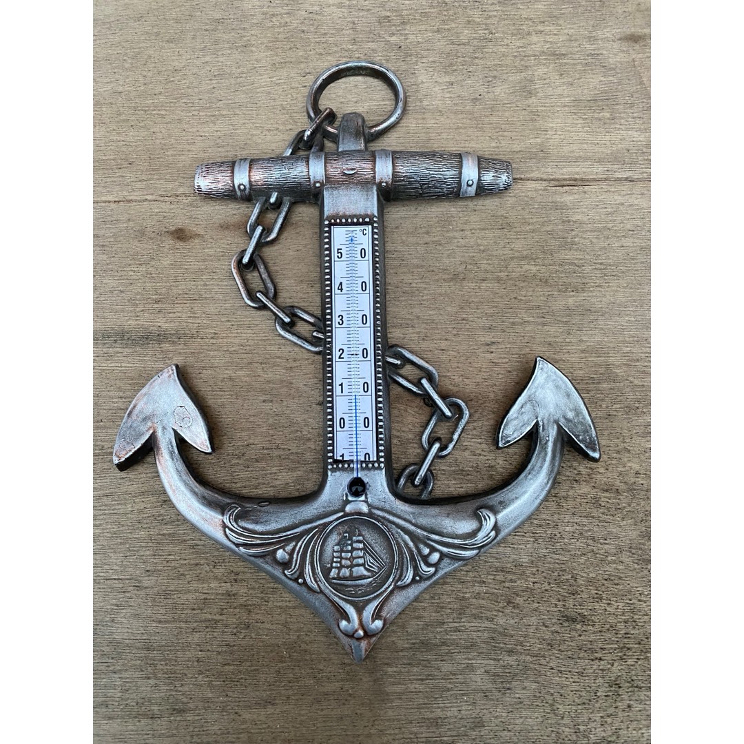 Termometr z okresu PRL osadzony na aluminiowej kotwicy. Wymiary; wys.23,5 x 17,5 cm.