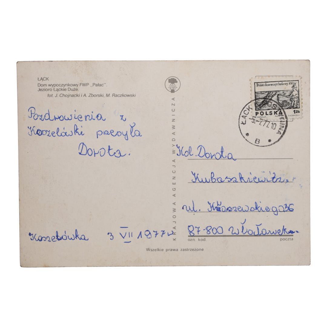 Wróć do przeszłości z tą wyjątkową pocztówką z Łącka z 1977 roku. Pocztówka przedstawia Dom Wypoczynkowy FWP "Pałac", położony w malowniczej scenerii nad jeziorem Łącko Duże. To nie tylko wspaniała pamiątka z okresu PRL, ale także okno na minione czasy, ukazujące urokliwe miejsce wypoczynku z tamtych lat.