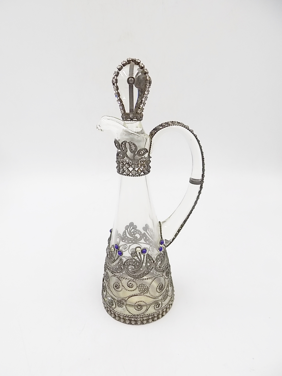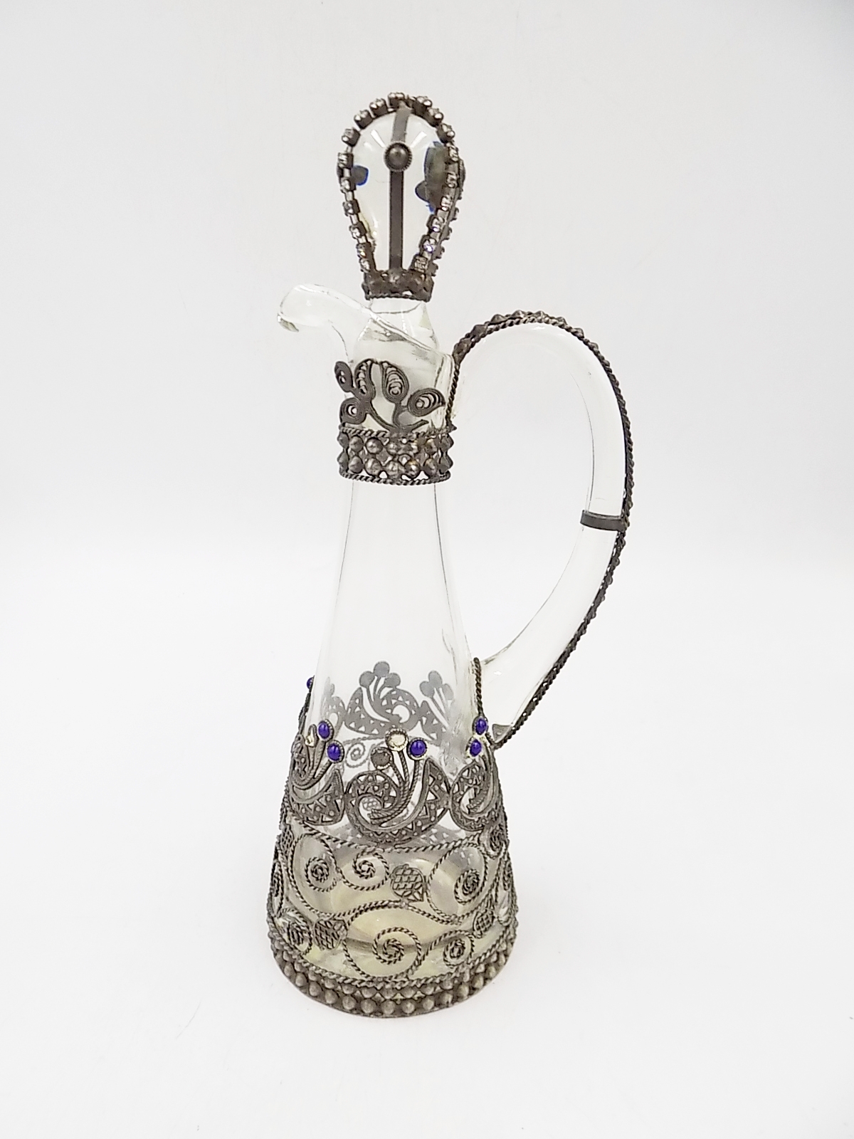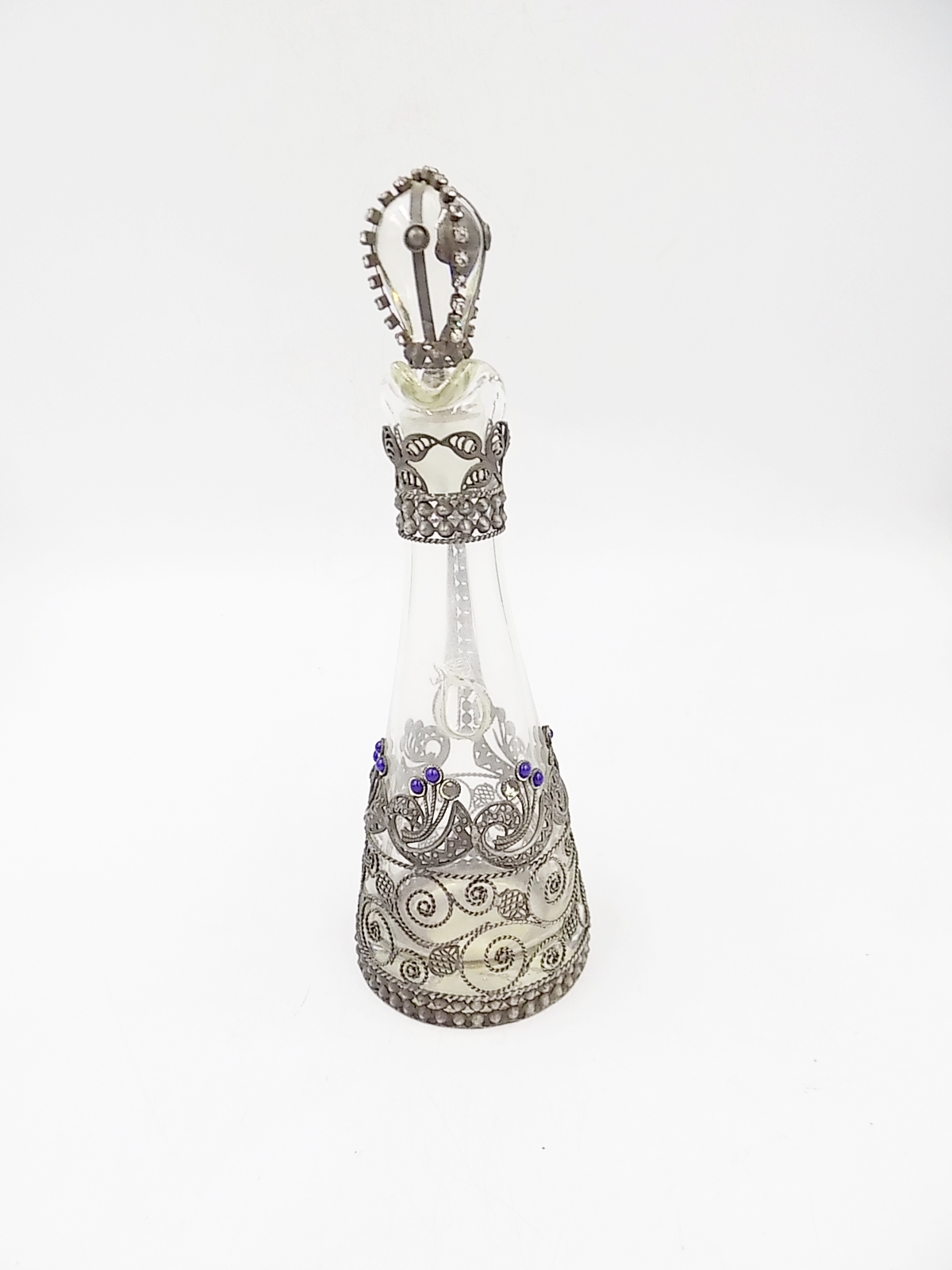 Szklana karafka dekorowana srebrem próby 925 z poł.XX w. Dziura w szkle. Wymiary; 22 x 7,5 cm