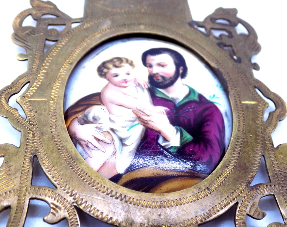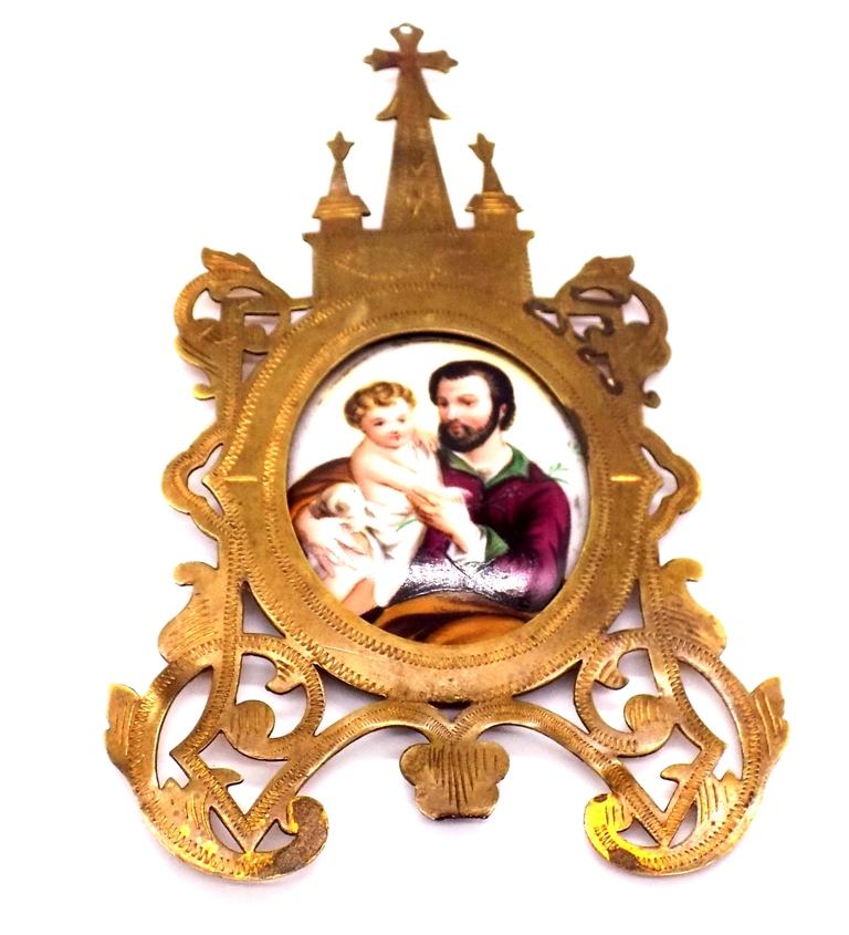 Wizerunek Józefa z dzieciątkiem , został namalowany na owalnej, porcelanowej płytce otoczonej metalową, ażurową konstrukcją przypominającą ołtarz.