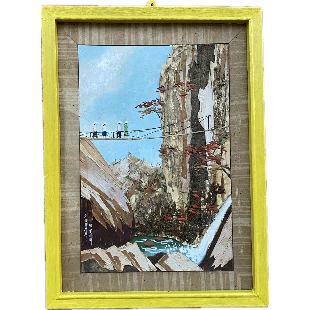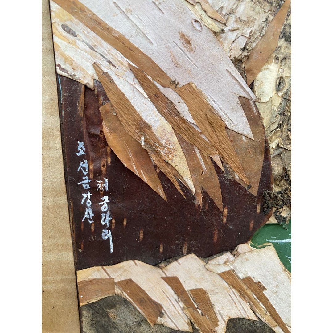 Dekoracja ścienna wykonana techniką mieszaną. Płatki kory połączone z techniką malarską. Pochodzenie prawdopodobnie Japonia z okresu PRL. Praca podpisana. Wymiary; wys.39 x 28,5 cm.