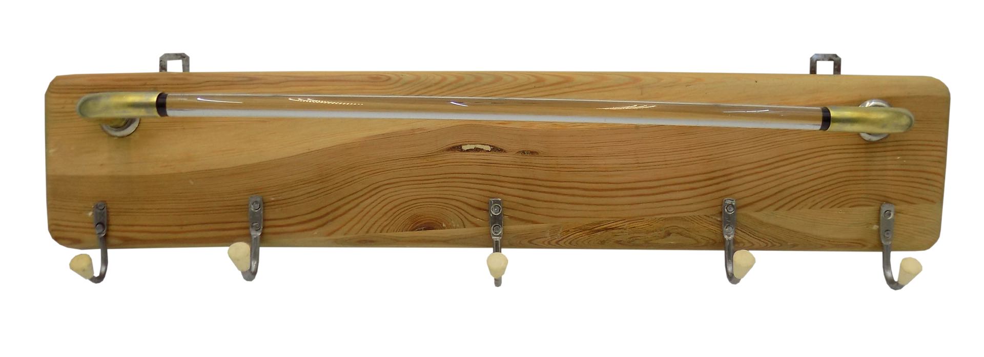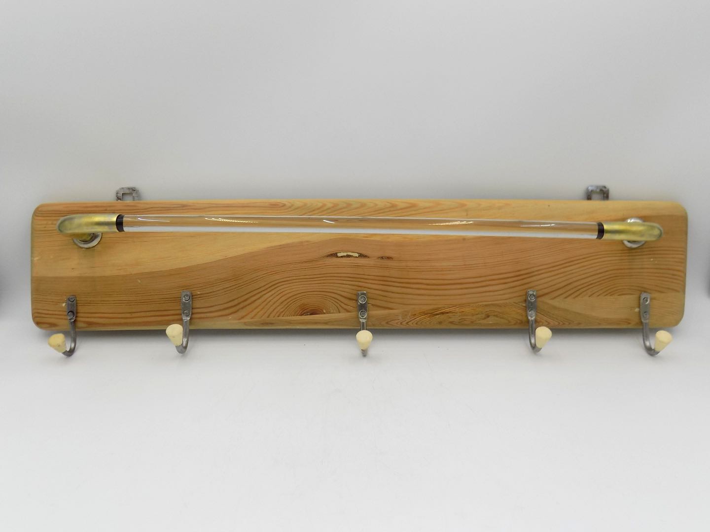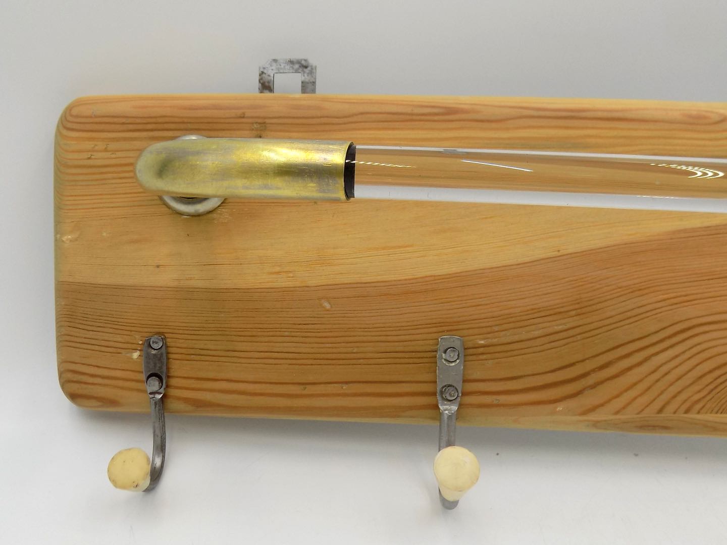 Wieszak został profesjonalnie odrestaurowany, dzięki czemu jest w doskonałym stanie. Szklany uchwyt został starannie wyczyszczony, a drewno sosnowe zostało odnowione, zachowując swoje naturalne piękno i wytrzymałość.
