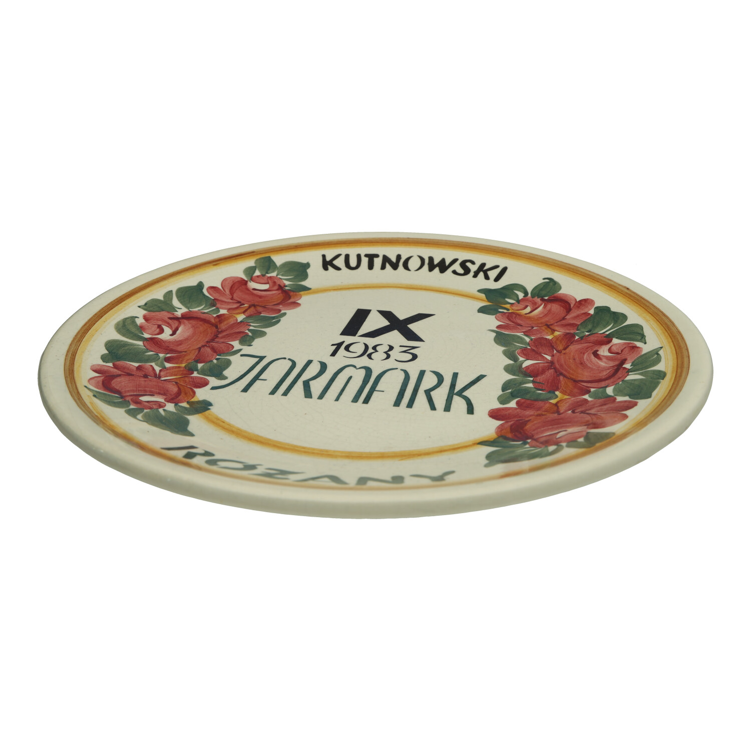 Fajansowy talerz okolicznościowy z ZF Koło, upamiętniający VIII Kutnowski Jarmark Różany, który odbył się w 1982 r. Sygnowany. Ręcznie malowany. Wymiary; 24 cm. /O.