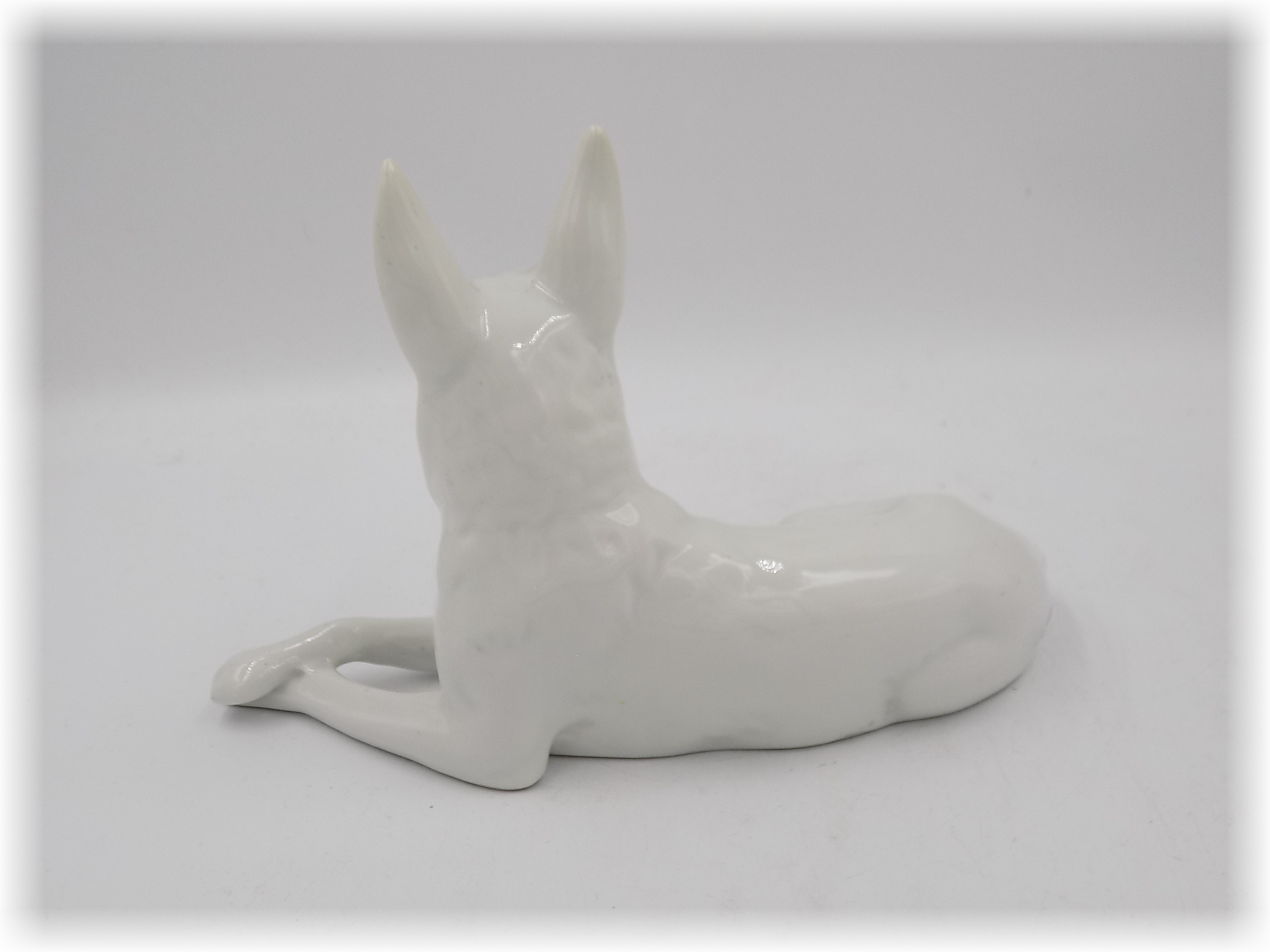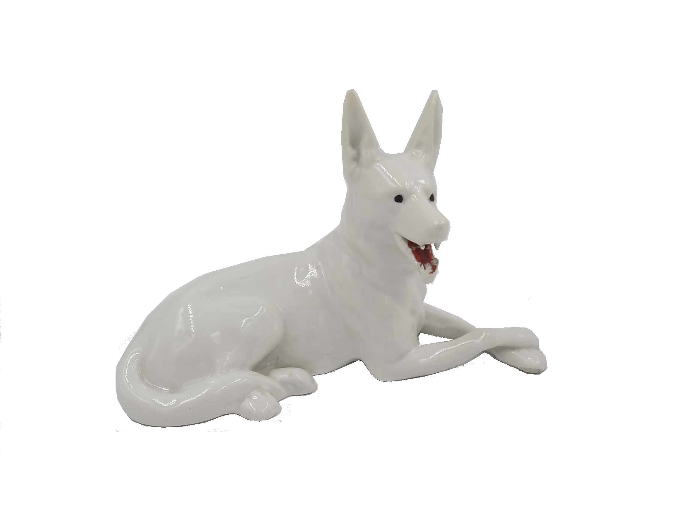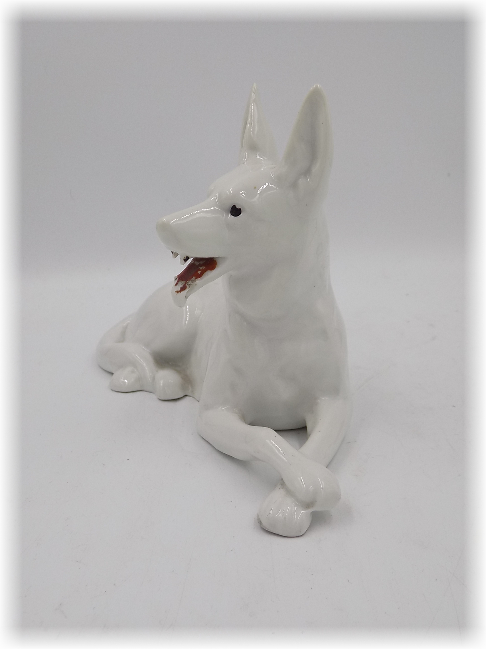 Porcelanowa figurka przedstawiająca owczarka niemieckiego z Zakładów Porcelany Stołowej Wałbrzych w Starym Zdroju. Sygnowana. Sygnatura stosowana od 1952 roku.Wymiary; wys.12 x 19,5 x 8 cm