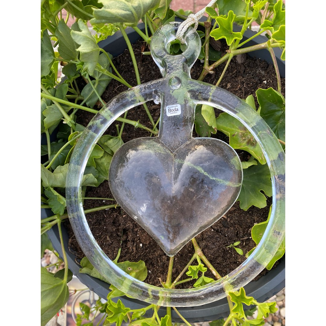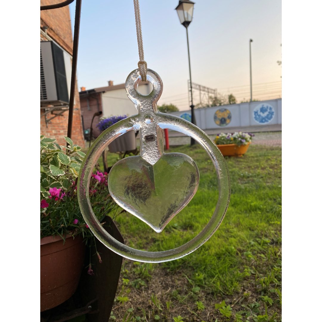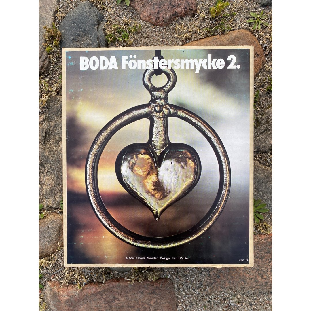 Bertil Vallien (1938- ) zaprojektował wiele klasyków dla szwedzkich hut szkła w Afors, Boda i Costa. Jedną z z najbardziej znanych serii jest Window Ornamets z 1971 roku. Składa się z 15 wisiorków z przezroczystego szkła, solidnych form i motywów zwierzęcych lub sercowych. Przedmiotem sprzedaży jest serce w oryginalnym opakowaniu i naklejką Boda. Wymiary opakowania; 26 x 23 x 5,5 cm. Wymiary szkła; 18 x 16 cm (5,9 cala).