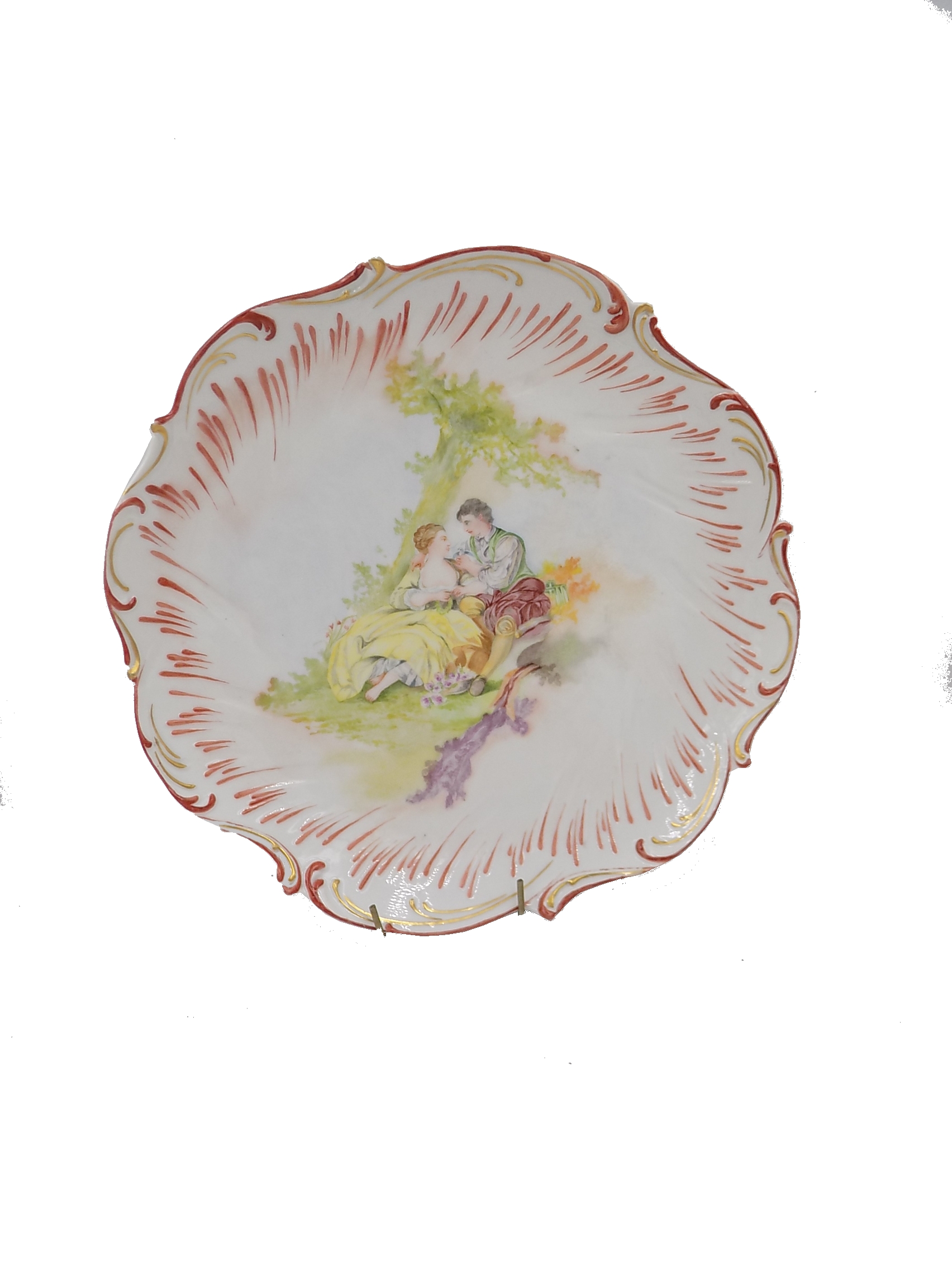 Porcelanowa patera dekoracyjna prawdopodobnie z jednej ze śląskich wytwórni porcelany z przełomu XIX i XX w. Sygnowana trzema wyciskanymi kreskami. Wymiary; 4 x 32 cm