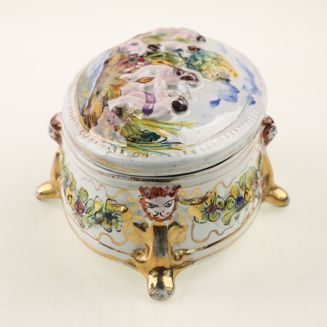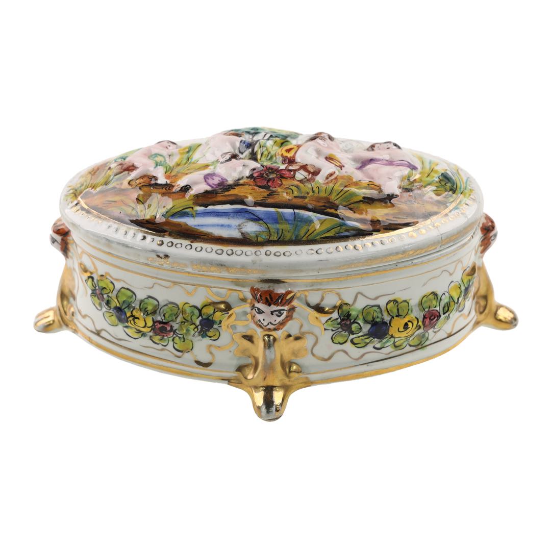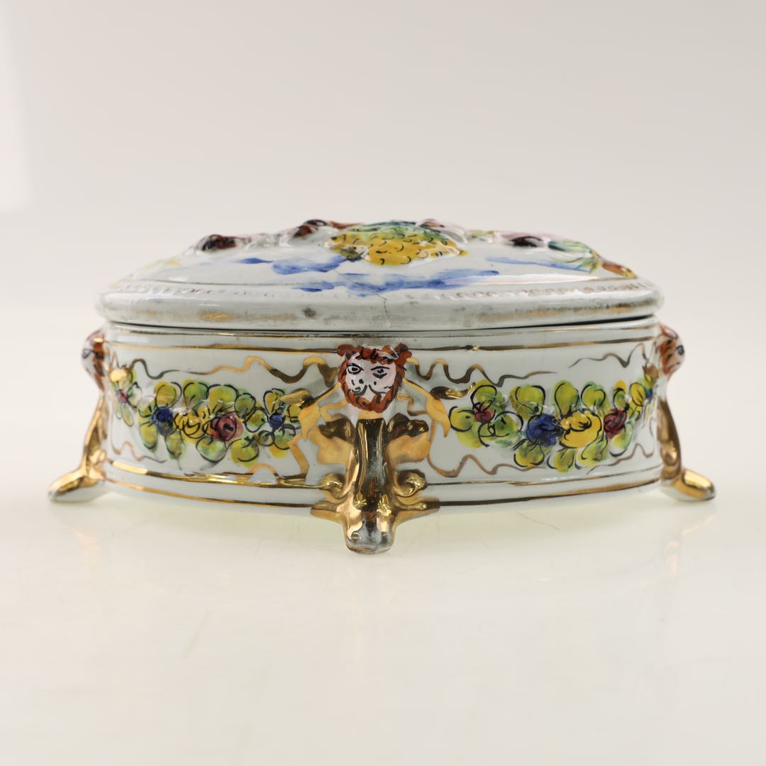 Szkatułka Majolica służy zarówno jako elegancki element dekoracyjny, jak i praktyczne miejsce do przechowywania drobiazgów i biżuterii. Ponieważ wieczko zostało starannie odrestaurowane, szkatułka zachowuje swój oryginalny urok i funkcjonalność.