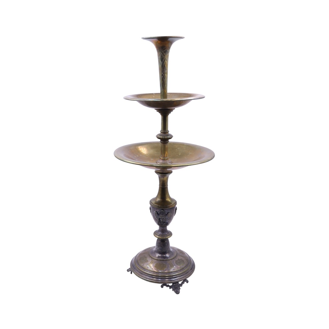 Zaawansowane zdobienia i detale ręcznie grawerowane na powierzchni karuzeli świadczą o finezji wykonania i dbałości o szczegóły charakterystycznej dla epoki, z której pochodzi. Gipsowy obciążnik w dolnej części zapewnia stabilność i równowagę, pozwalając na bezpieczne i eleganckie wyeksponowanie różnorodnych słodyczy, podkreślając ich wyjątkowy charakter.