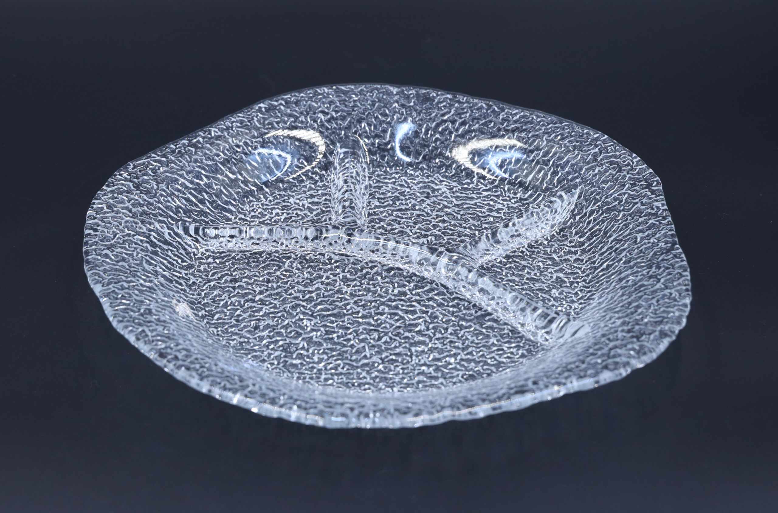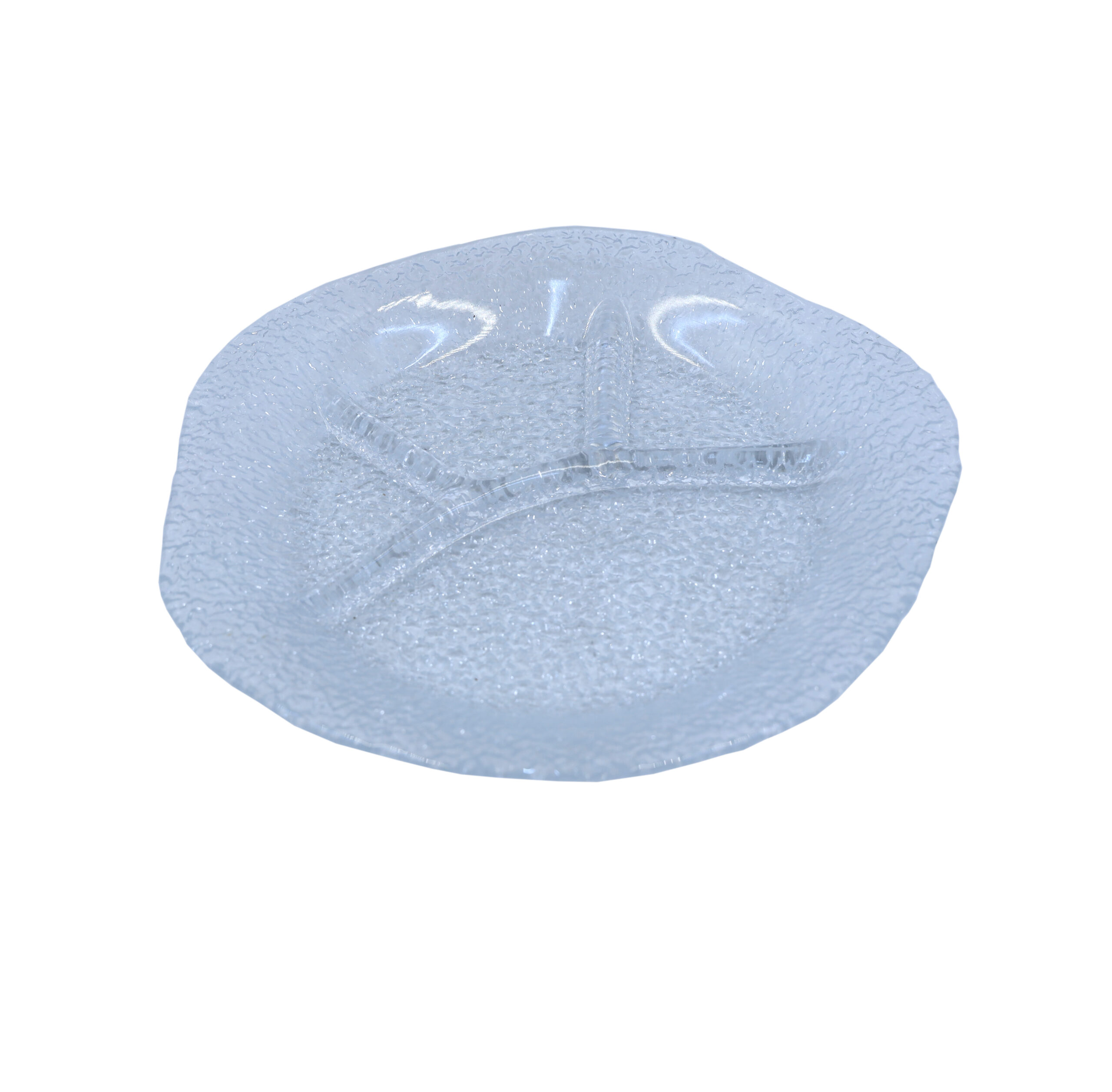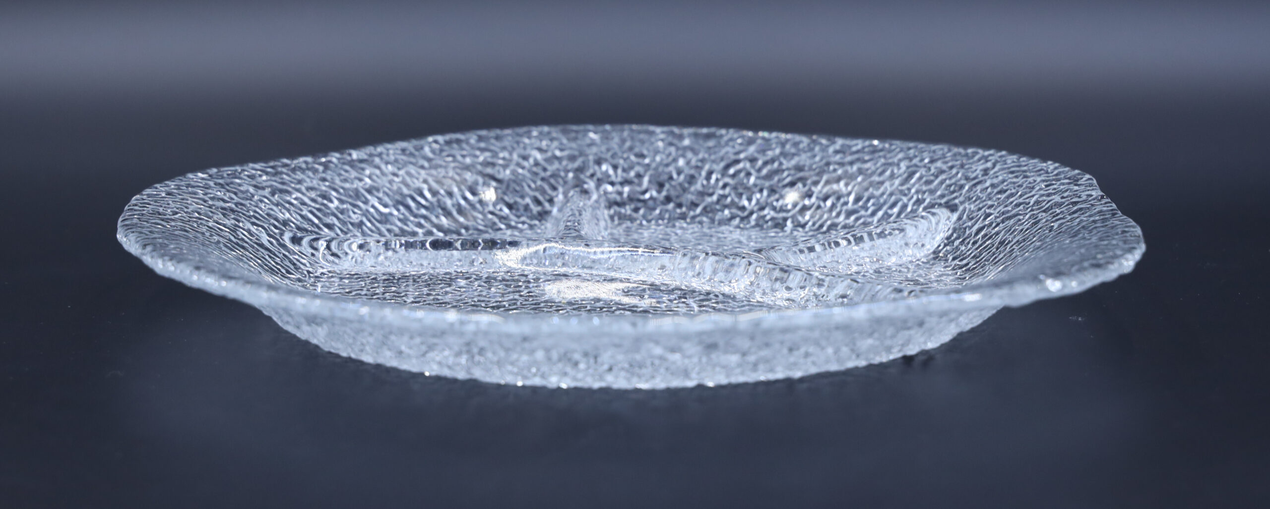 Bezbarwny, dzielony półmisek ze szkła prasowanego. Wzór “Sahara”, zaprojektowany przez Jana Sylwestra Drosta, wyprodukowana w Hucie Szkła Ząbkowice w latach 70-tych.