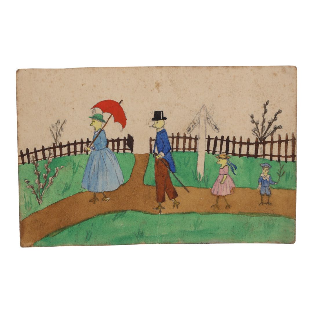Ta ręcznie malowana pocztówka przedstawiająca rodzinę na spacerze to wyjątkowy i niepowtarzalny przedmiot, który zachwyci każdego miłośnika sztuki.
