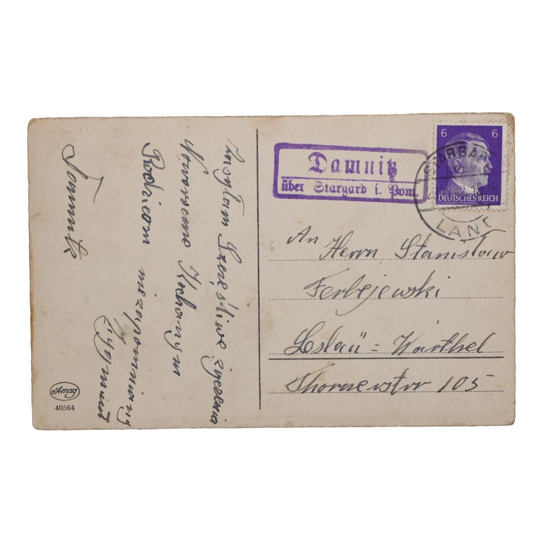 Oryginalna pocztówka z Damnitz z czasów II wojny światowej, wysłana z Leslau.