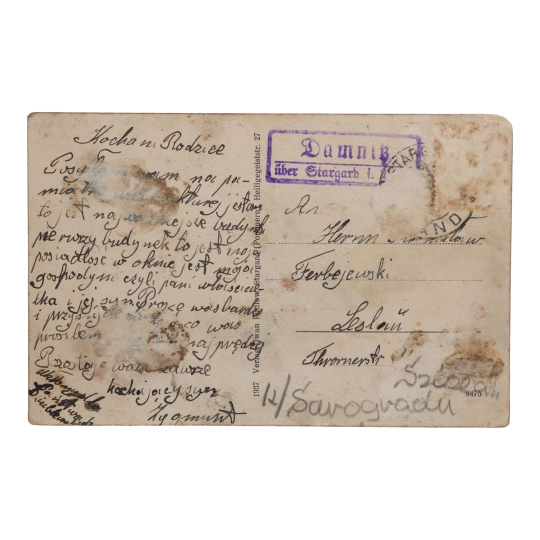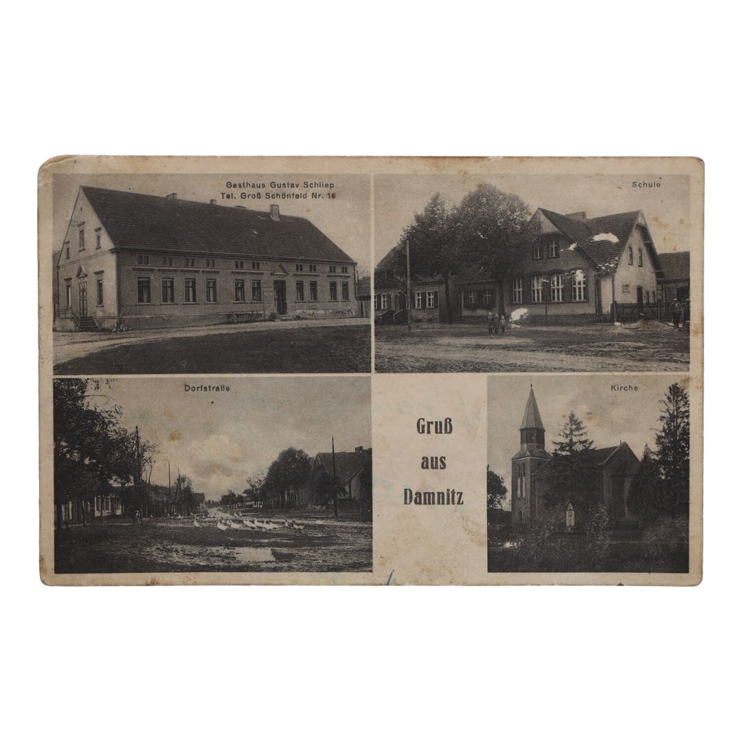 Cechy: Oryginalna pocztówka z Damnitz, datowana na okres II wojny światowej.