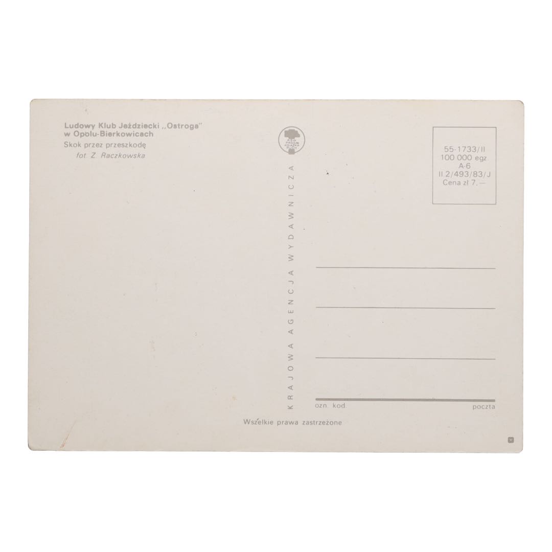 Zapraszamy do odkrycia unikalnego fragmentu historii Polski poprzez tę wyjątkową pocztówkę z Ludowego Klubu Jeździeckiego "Ostroga" w Opolu-Bierkowicach. Ten wyjątkowy przedmiot to nie tylko zwykła pocztówka, ale prawdziwe okno w przeszłość, ukazujące życie i kulturę Polski w czasach PRL.