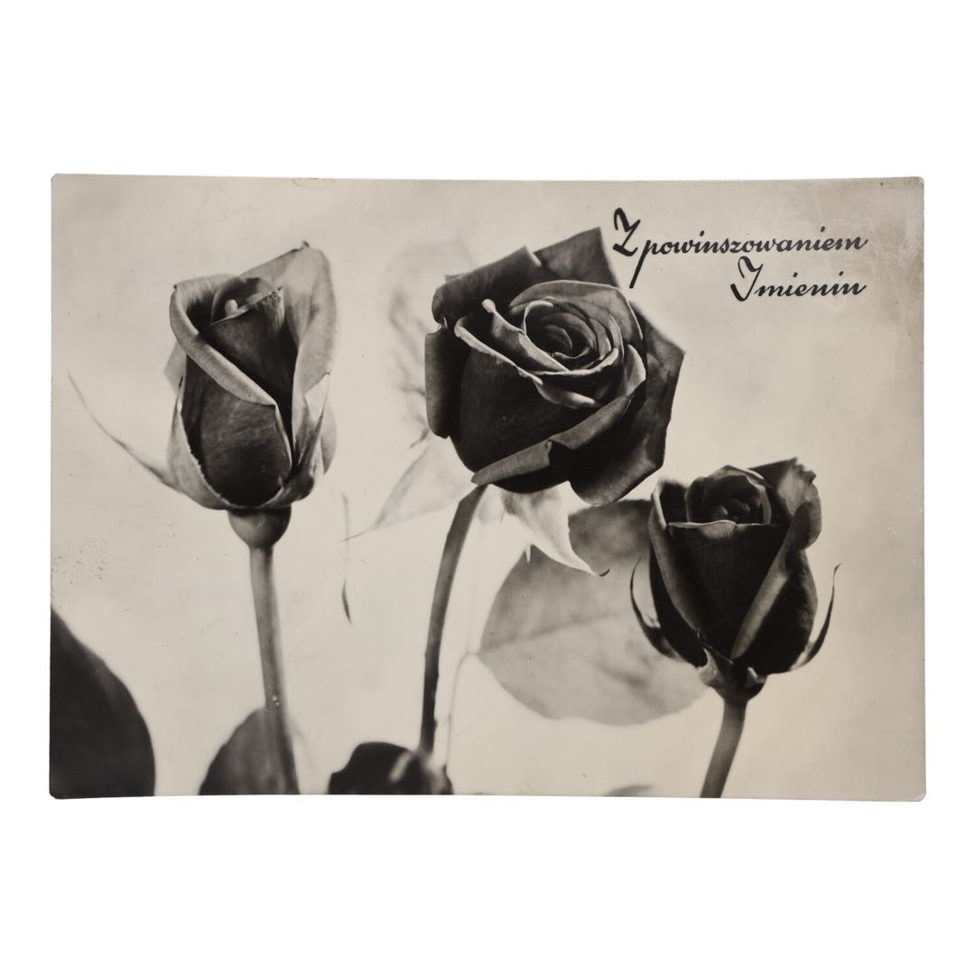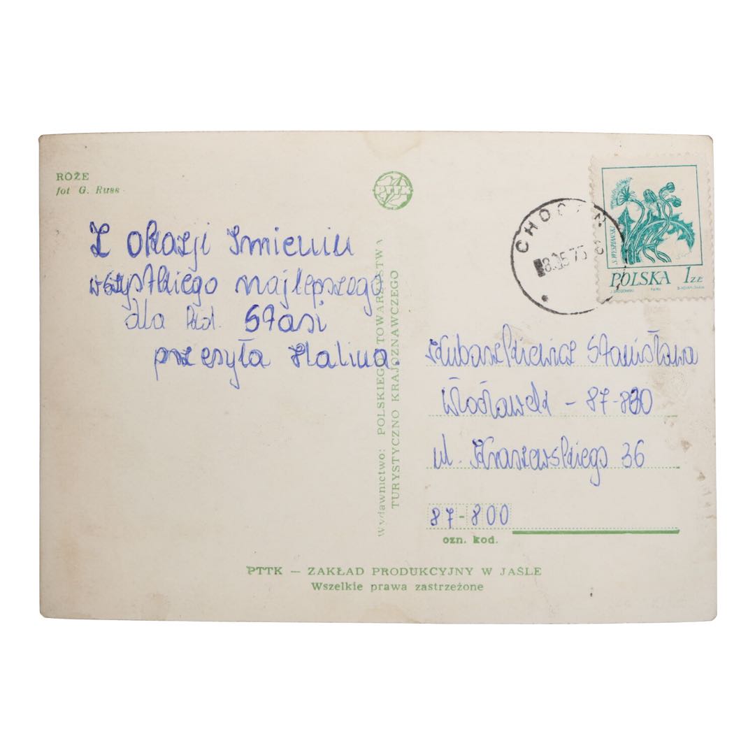 Opis: Wyjątkowa pocztówka okolicznościowa z czasów PRL-u, ozdobiona pięknym motywem róży.