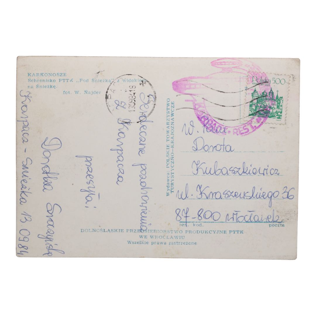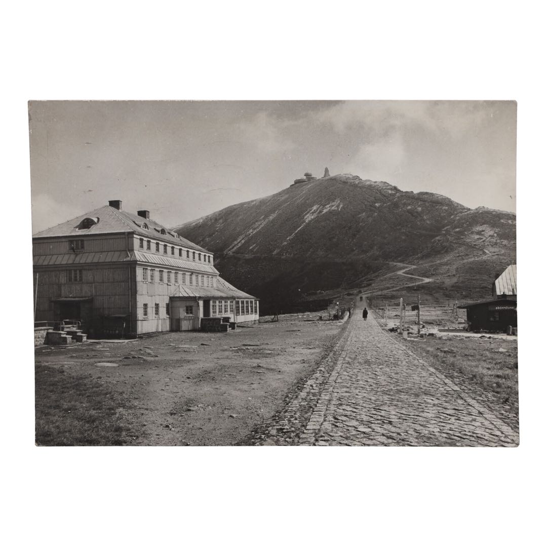 Pocztówka PRL, pocztówka Karkonosze, widok na Śnieżkę, pocztówka schronisko PTTK, pocztówki retro, pocztówki z gór, pamiątki Karkonosze, pocztówki historyczne, pocztówki turystyczne, pocztówki kolekcjonerskie
