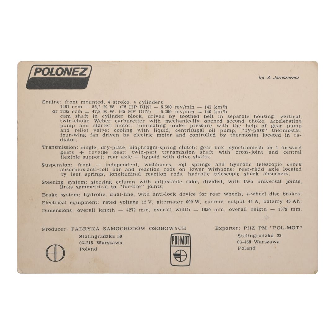 Odkryj kawałek historii polskiej motoryzacji dzięki tej oryginalnej pocztówce reklamowej Pol-Mot Polonez. Idealna dla kolekcjonerów, entuzjastów motoryzacji i miłośników historii, ta pocztówka przenosi nas w czasie do złotej ery polskiej produkcji samochodów.