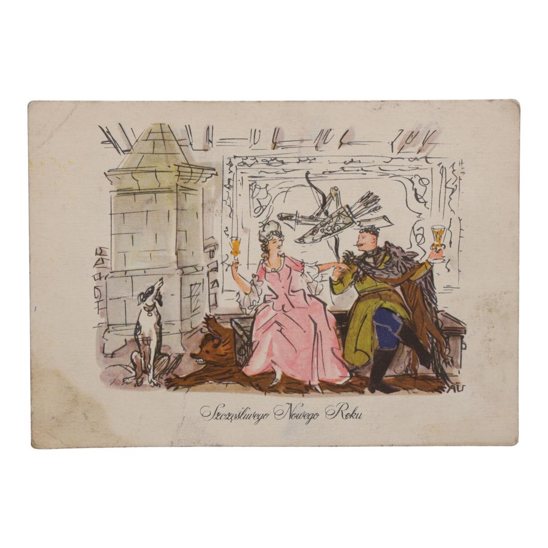 Ta piękna pocztówka autorstwa Antoniego Uniechowskiego to prawdziwa gratka dla miłośników sztuki i historii. Została wydana w Polsce i przedstawia tradycyjne polskie obchody Nowego Roku.
