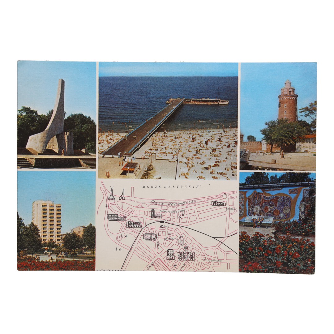 Oferujemy wyjątkową pocztówkę vintage z wizerunkiem malowniczego miasta Kołobrzeg, które przetrwało burzliwe czasy II wojny światowej, by stać się dzisiaj pełnoprawnym uzdrowiskiem nad Bałtykiem. To niezwykły kawałek historii, który teraz możesz mieć w swojej kolekcji.