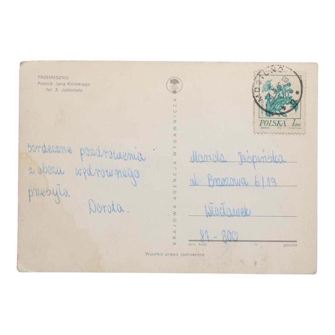 Prezentujemy wyjątkową pamiątkę wśród zabytkowych pocztówek - wyjątkowy widok pomnika Jana Kilińskiego w Trzemesznie. Ta niezwykła pocztówka o wymiarach 10,5 x 15 cm to doskonały przykład historii zamkniętej w niewielkim formacie, łączącej piękno dawnej sztuki pocztówkowej z bogatą historią Polski.