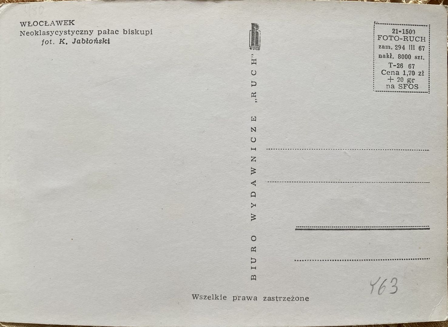 Wybierz się w podróż w czasie z naszym wyjątkowym skarbem - pocztówką z Włocławka, przedstawiającą neoklasycystyczny pałac biskupi w okresie PRL!