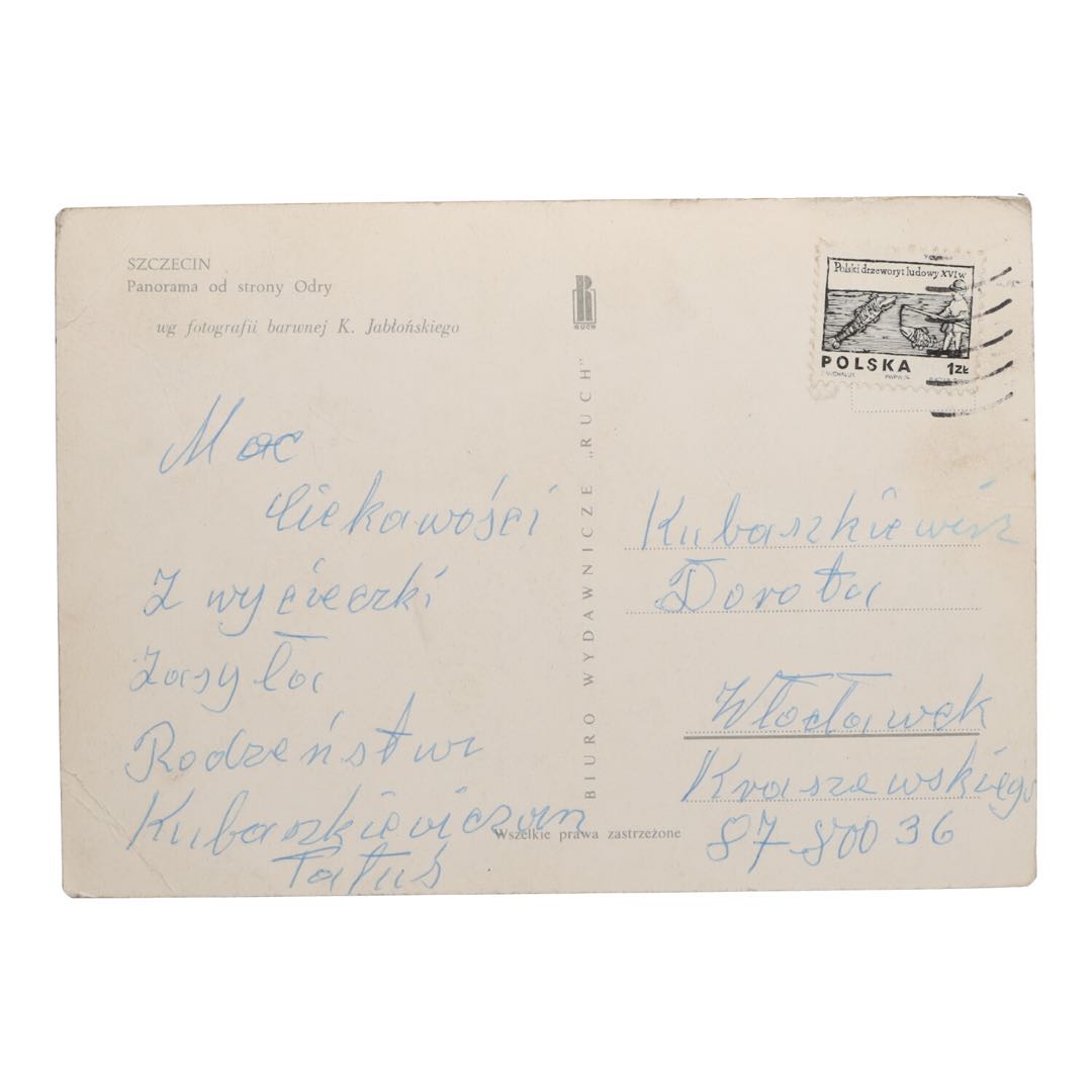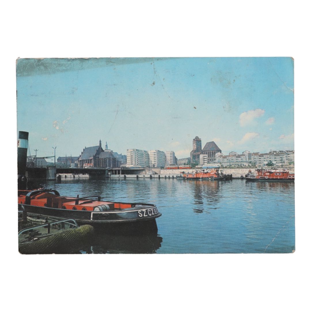 Pocztówka przedstawiająca panoramę Szczecina od strony Odry. To wyjątkowy przedmiot, który zachwyci każdego miłośnika historii i PRL-u.