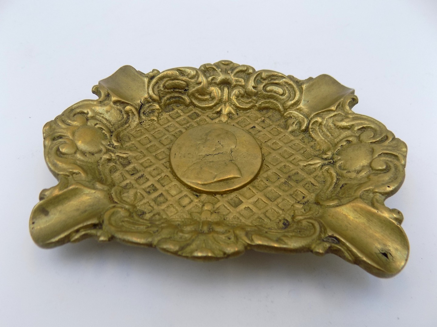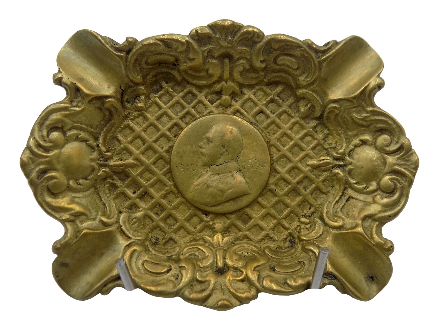 W centrum popielniczki znajduje się wizerunek samego władcy - Jerzego V. Ten mistrzowsko wykonany wizerunek oddaje nie tylko jego wygląd zewnętrzny, ale także emanuje godnością i charyzmą, które były charakterystyczne dla tego okresu monarchicznego. Wizerunek ten, uwieczniony na trwałym i pięknie oksydowanym mosiądzu, stanowi centralny punkt kompozycji, przyciągając wzrok i dodając produktowi wyjątkowego charakteru.