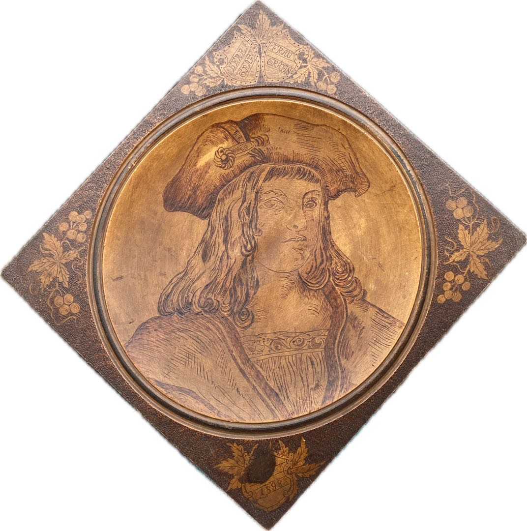 Ręcznie wykonana praca wykonana techniką rytowania w drewnie przedstawiająca panią Gryfin z 1898 roku. Wymiary; 25 x 26 cm.