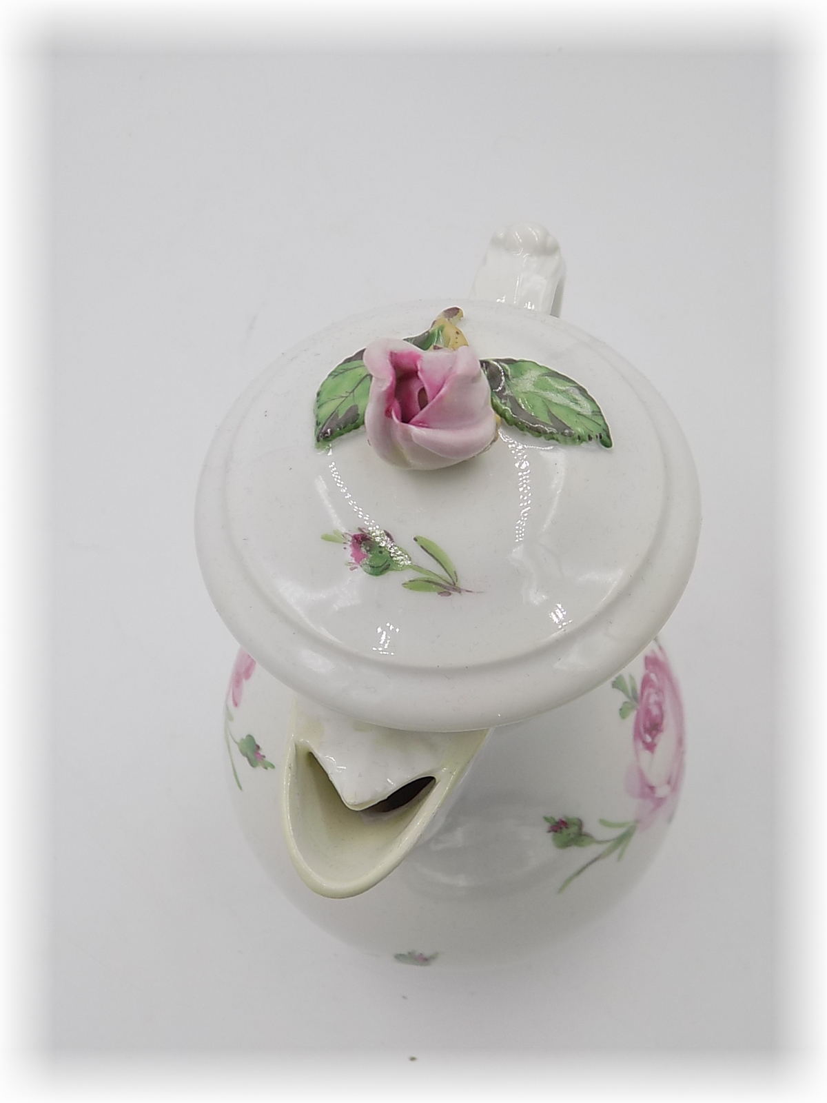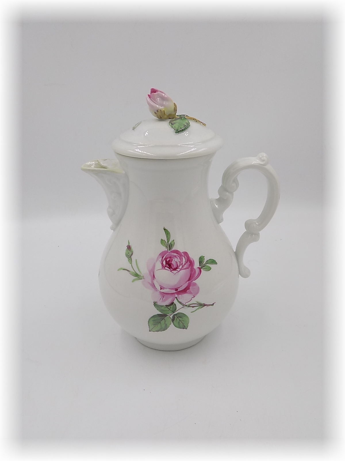 Dzbanek z fabryki Teicherta w Meissen. Sygnatura stosowana w latach 1882-1929. Dzbanek naprawiany przy wylewce. Wymiary; 21 cm.
