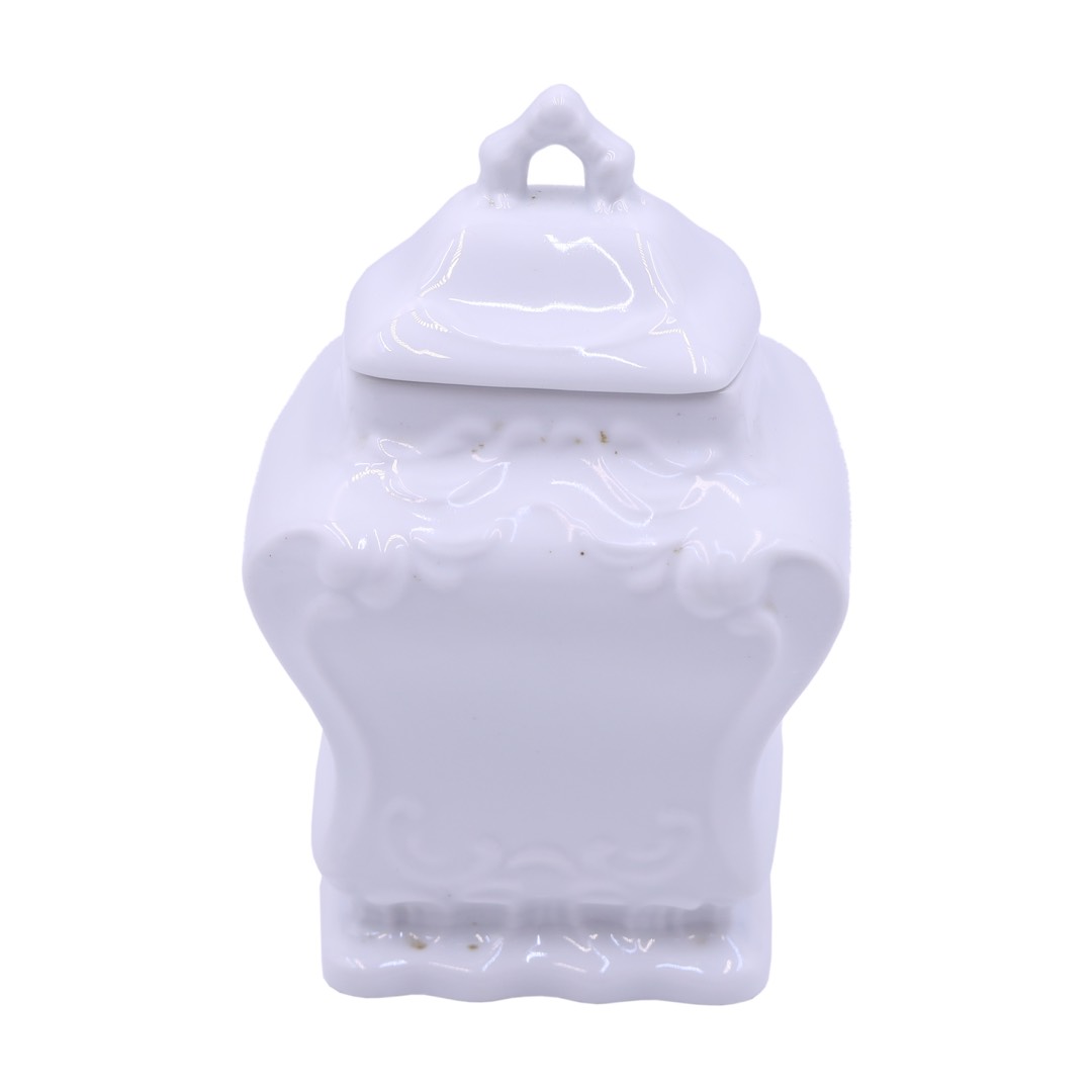 Wymiary tej porcelanowej puszki wynoszą 15,5 x 10 x 9,5 cm, co czyni ją idealnym przedmiotem do wyeksponowania w kolekcji antyków lub na półce jako dekoracja wnętrza. Jej delikatna kolorystyka i klasyczny design będą pasować do wielu różnych stylów dekoracyjnych, dodając pomieszczeniu elegancji i uroku.