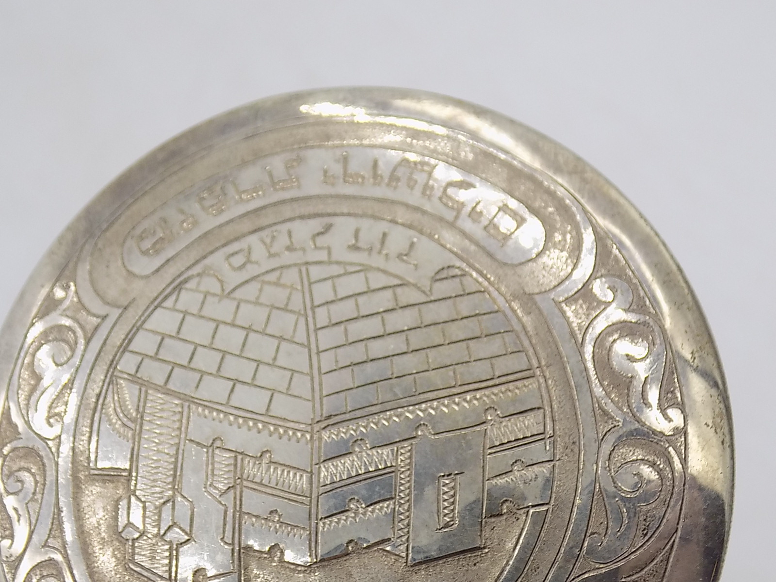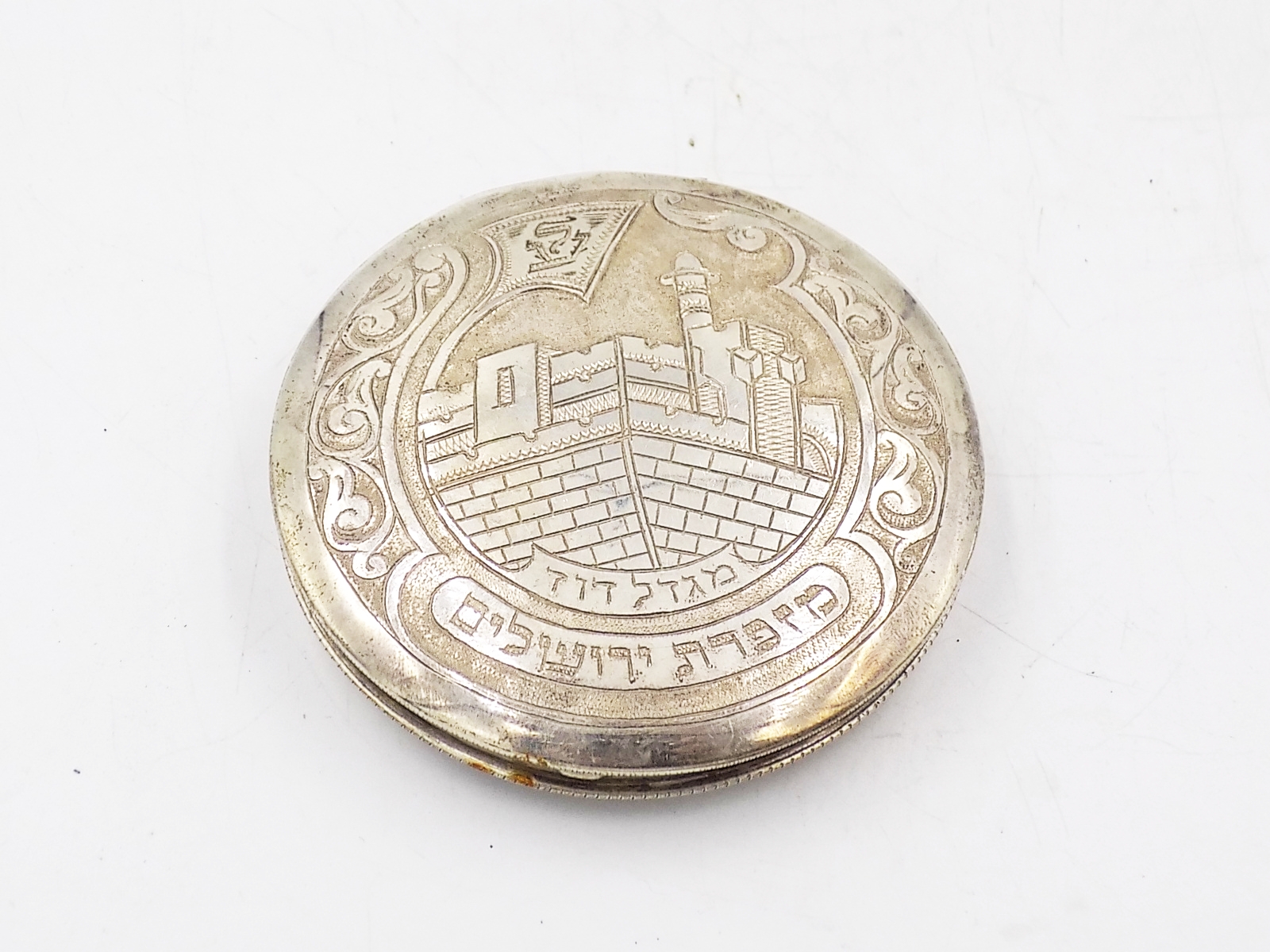 Srebrna puderniczka z 1947 ro. Sygnowana. Dedykacja. Lusterko pęknięte. Wymiary; 8,5 cm
