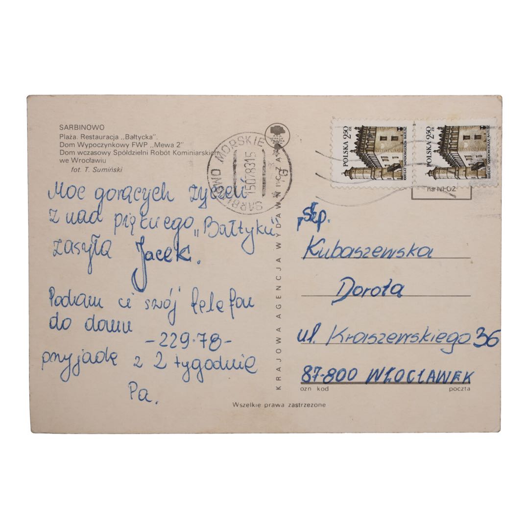 Zanurz się w historii dzięki tej wyjątkowej pocztówce z Sarbinowa, przedstawiającej kultowe miejsca z okresu PRL. Widok obejmuje słynną sarbinowską plażę, popularną restaurację "Bałtycka", Dom Wczasowy FWP "Mewa 2" oraz Dom Wczasowy wrocławskiej Spółdzielni Robót Kominiarskich. Pocztówka ta to nie tylko urokliwy widok nadmorskiego krajobrazu, ale także nostalgiczne spojrzenie w przeszłość, oddające klimat wakacyjnego wypoczynku w latach PRL-u.