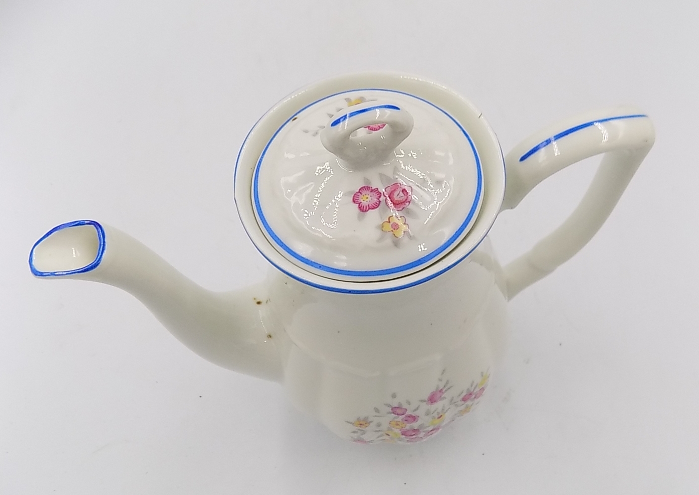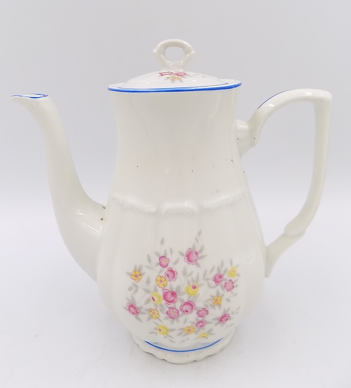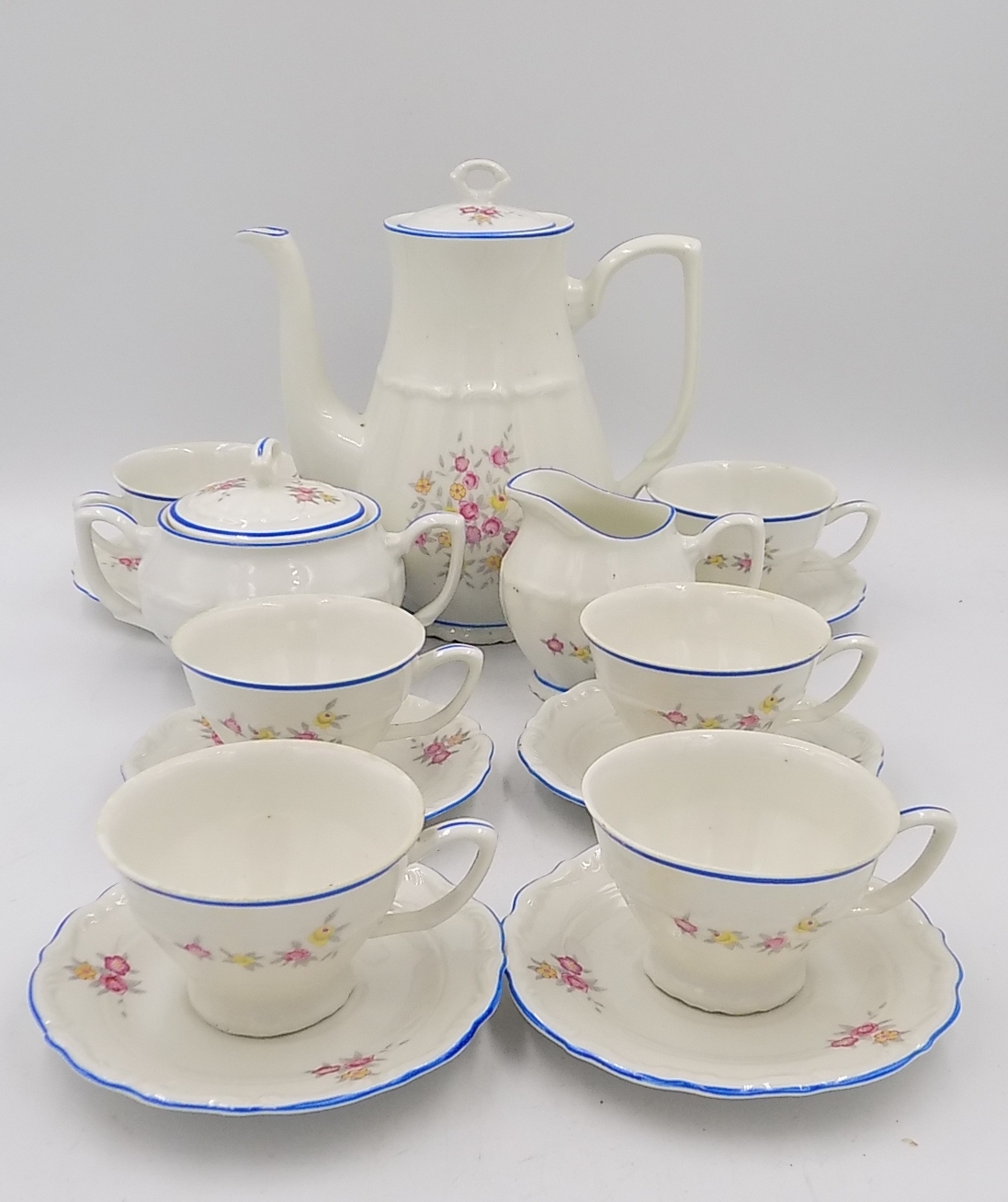Serwis kawowy na 6 osób z lat 60-tych z Fabryki Porcelany Bogucice. Sygnatura stosowana od 1952 r. Wymiary; dzbanek 17,5 cm, cukiernica 8,5 cm, mlecznik 7,5 cm, filiżanki wys.4,5 x 7,5 cm, talerzyki 11 cm. Polecam kolekcjonerom